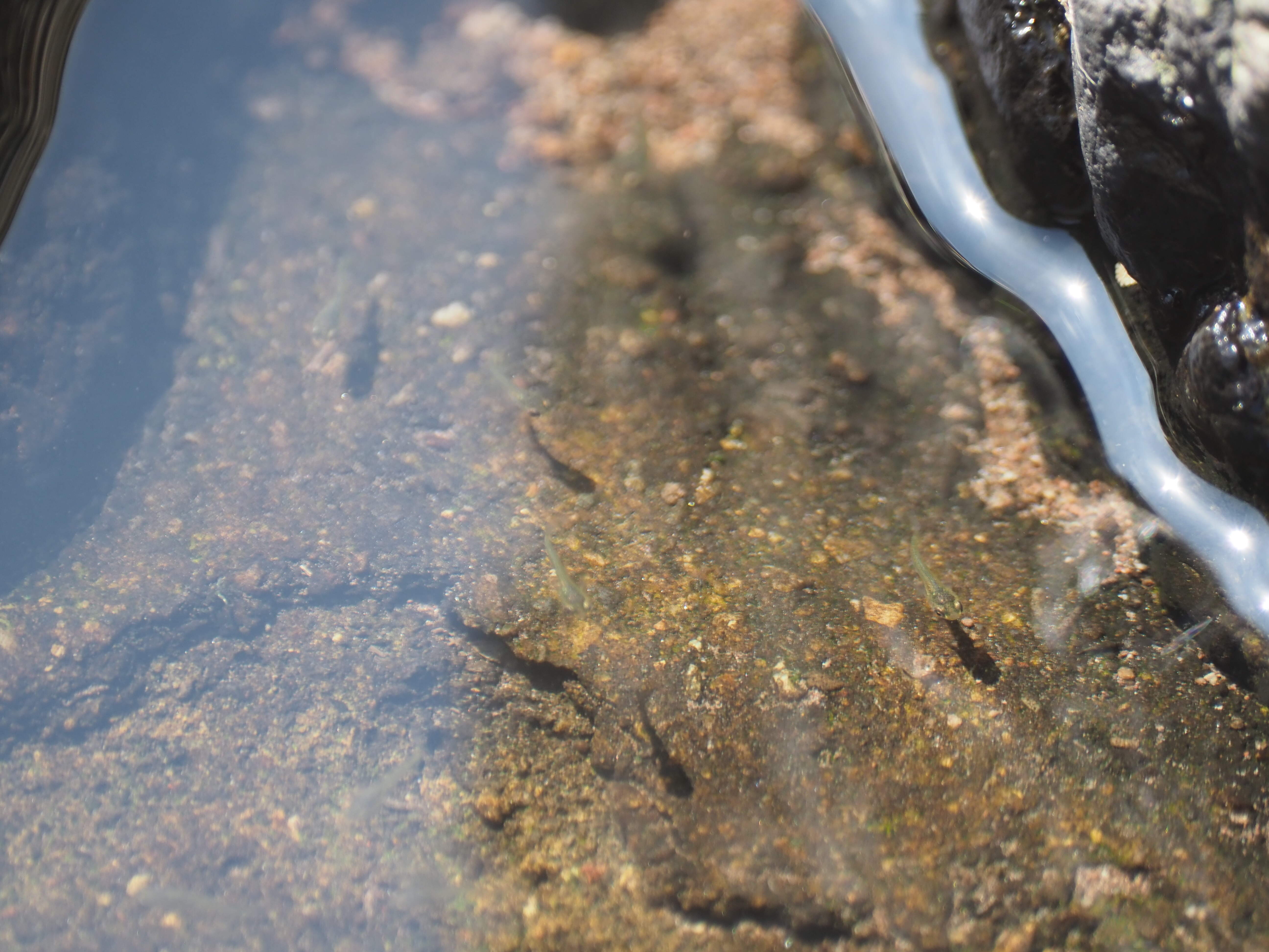 上段の五連の飛び石の周囲にも小さな魚が泳いでいます。 お、カダヤシ疑惑の魚のようですね、ここにもいたんだ。 なお、下段の四連の飛び石の周囲には魚はいませんでした。