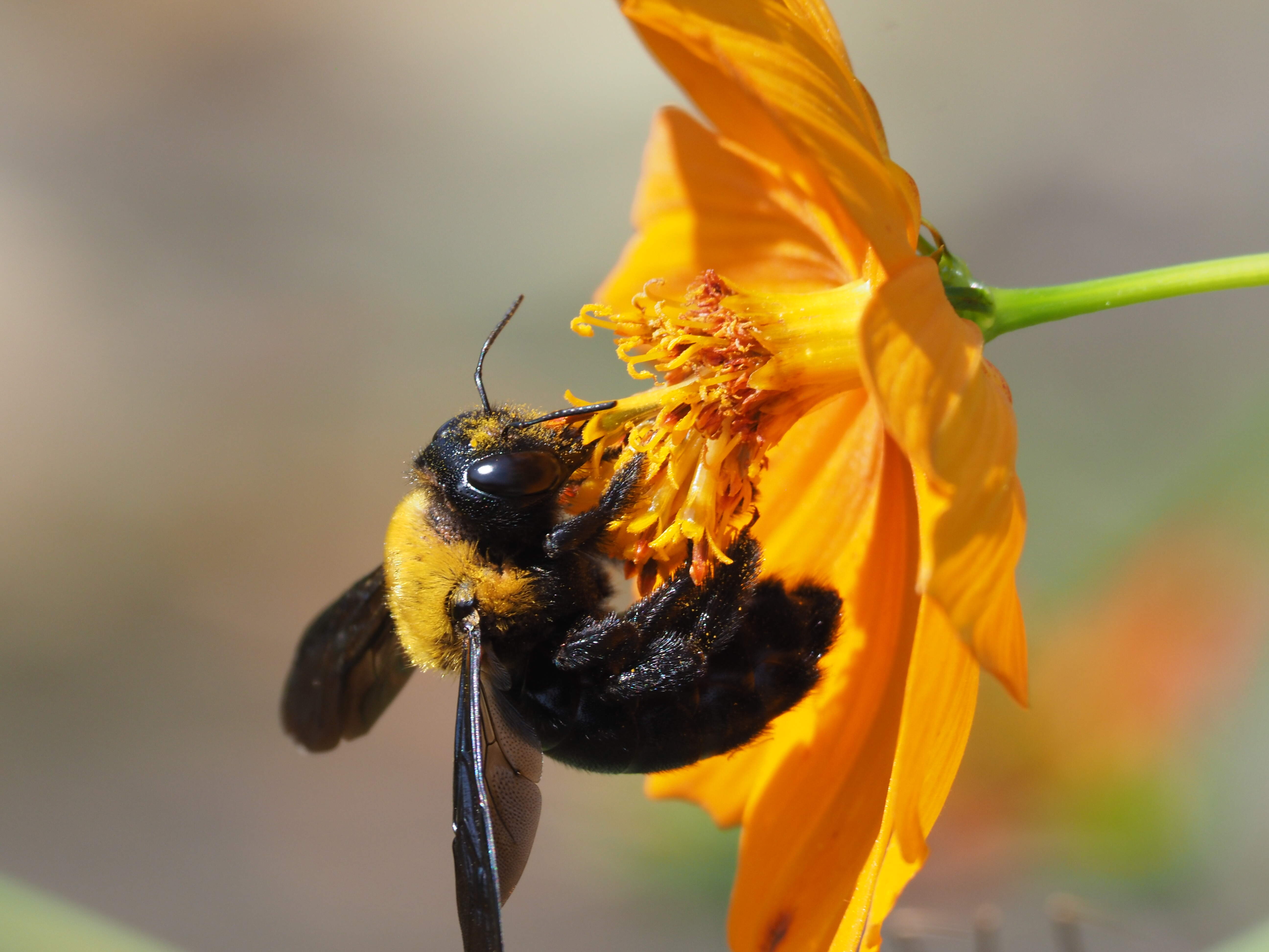ブーンという重低音がする方を見ると、クマバチもキバナコスモスの花の蜜を吸いにやってきていました。 クマバチはカワイイので癒やされます。