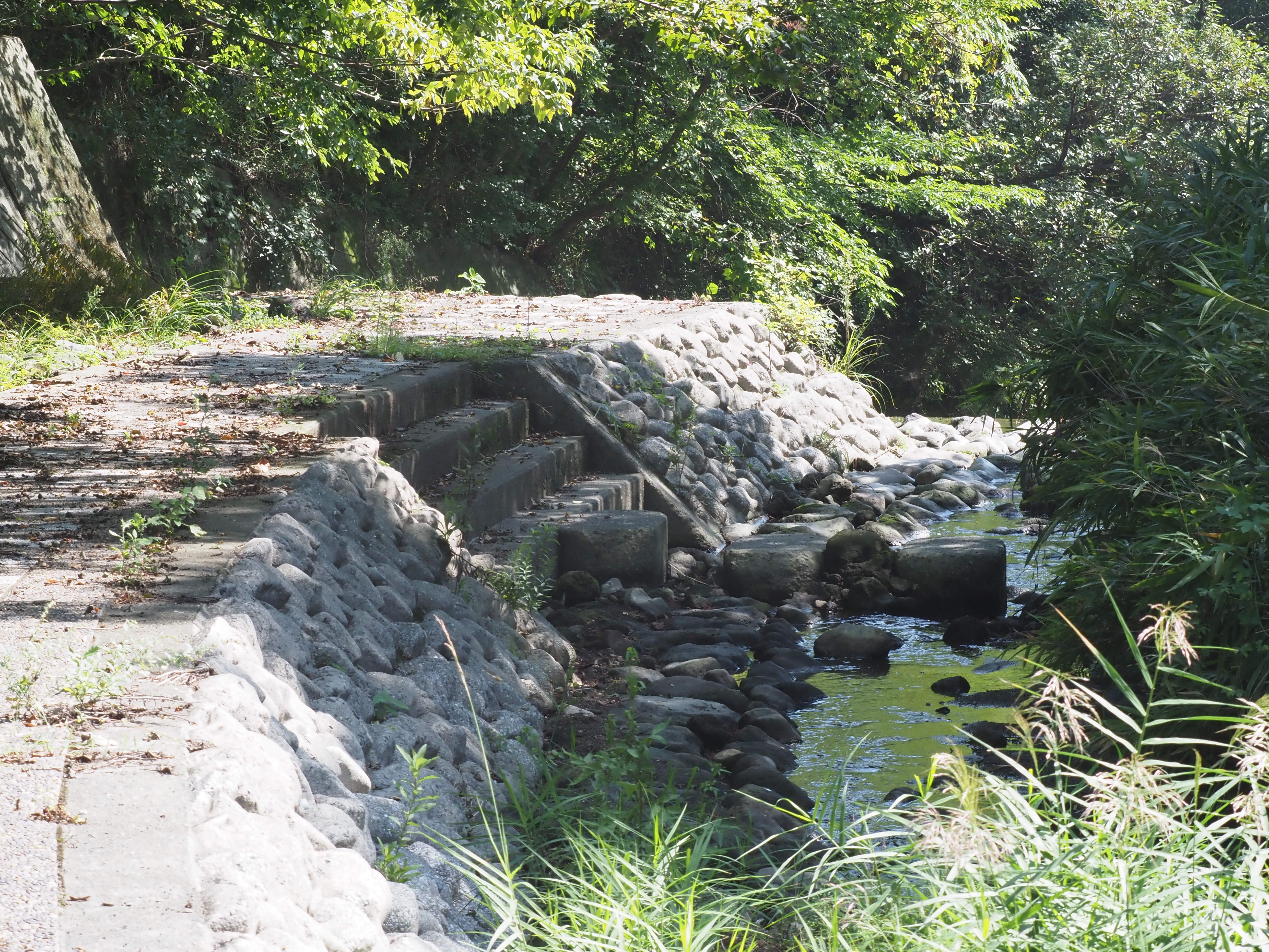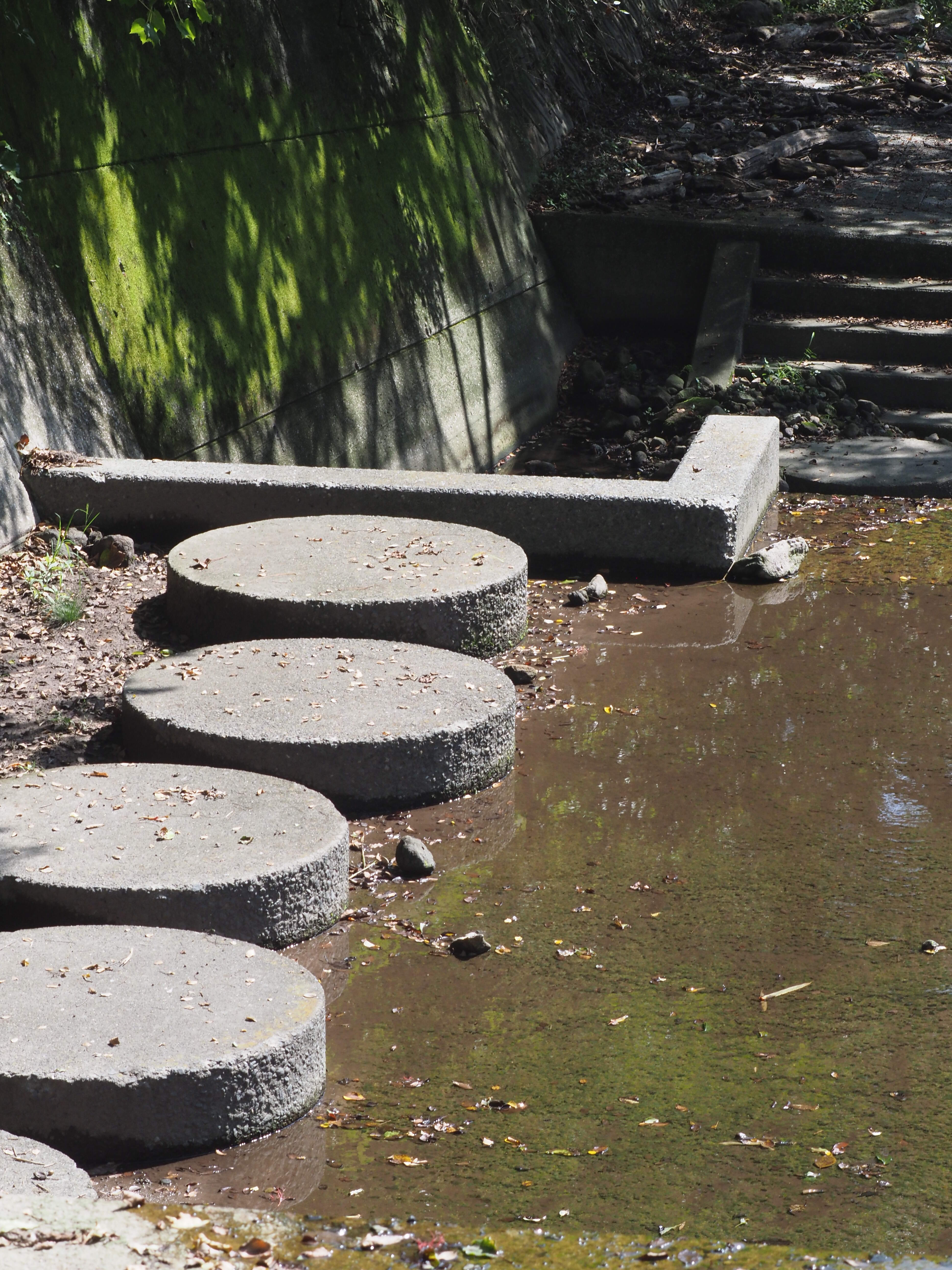 境川(別府市) 飛び石で対岸へ渡って土手上の遊歩道へ画像を拡大する