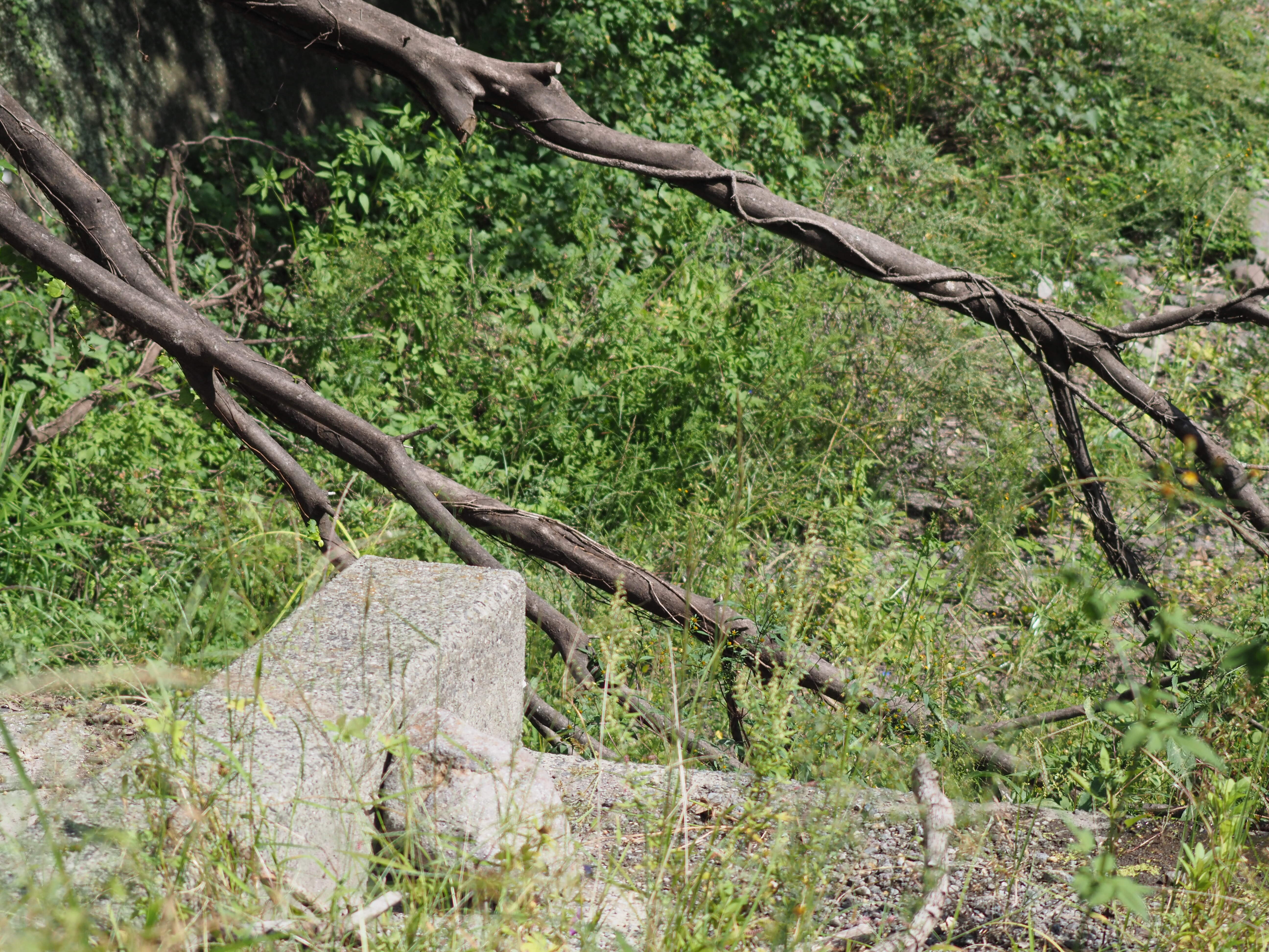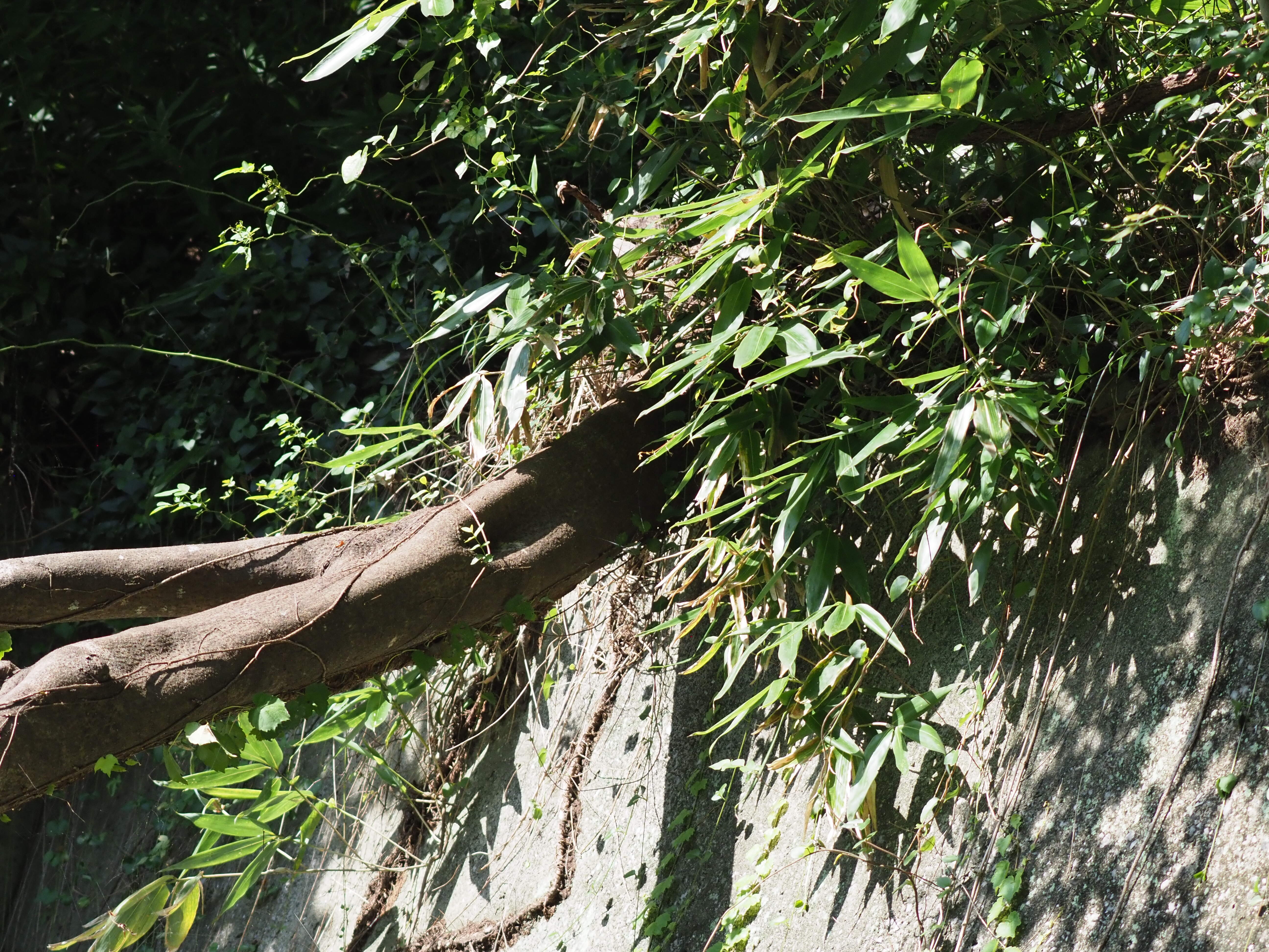 振り返ると倒木の根本が見えます。 倒木の根本は、土手のコンクリートに引っかかっているだけのようです。 こうして眺めてみると、何かあればずり落ちてきそうなとても危険な状況です。 よかったです、潰されなくて。