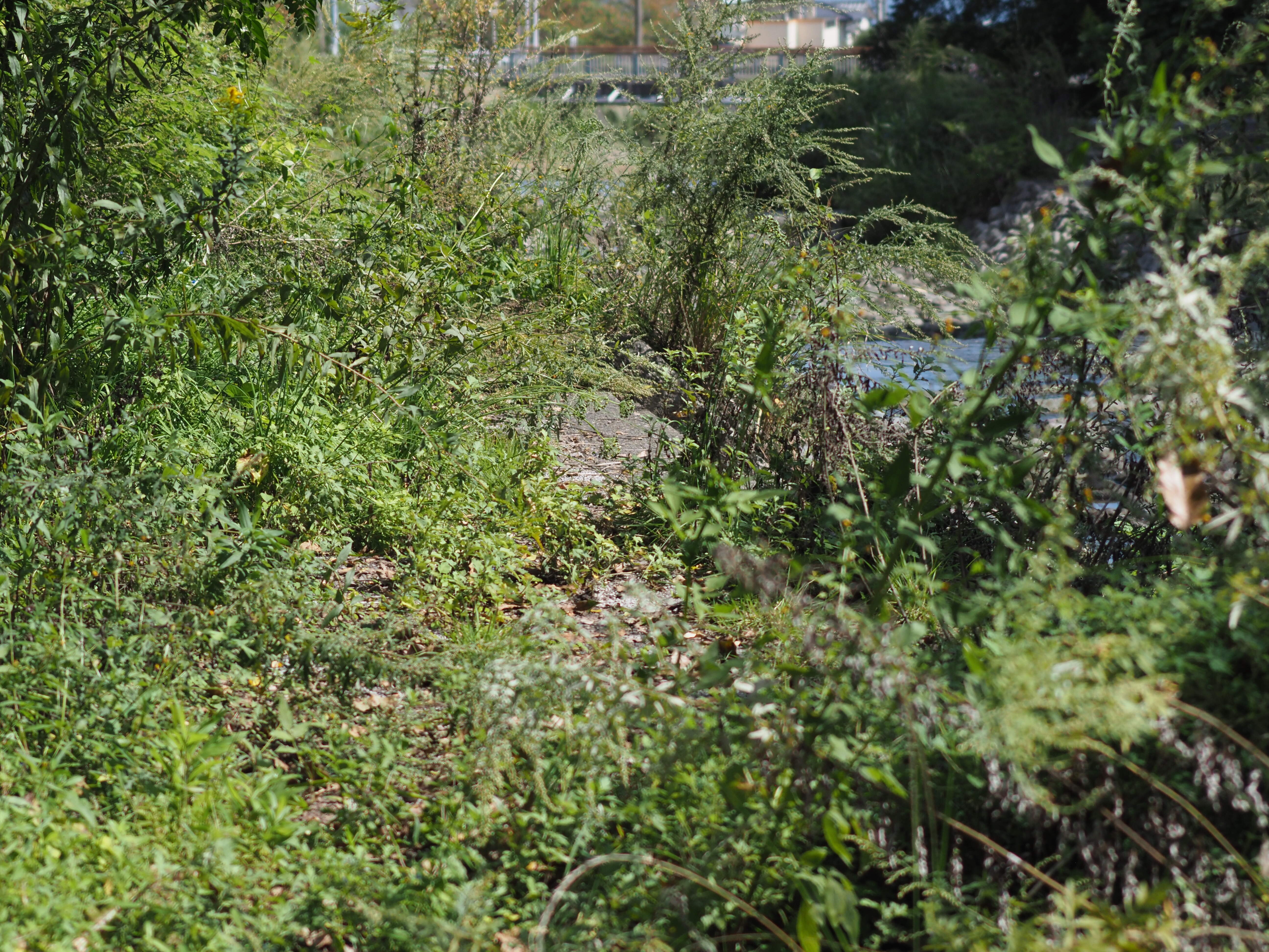 古戦場橋の真下の左岸はつる性植物でビッシリと覆われています。 蛇がいる可能性を考えると通る気にはなれません。