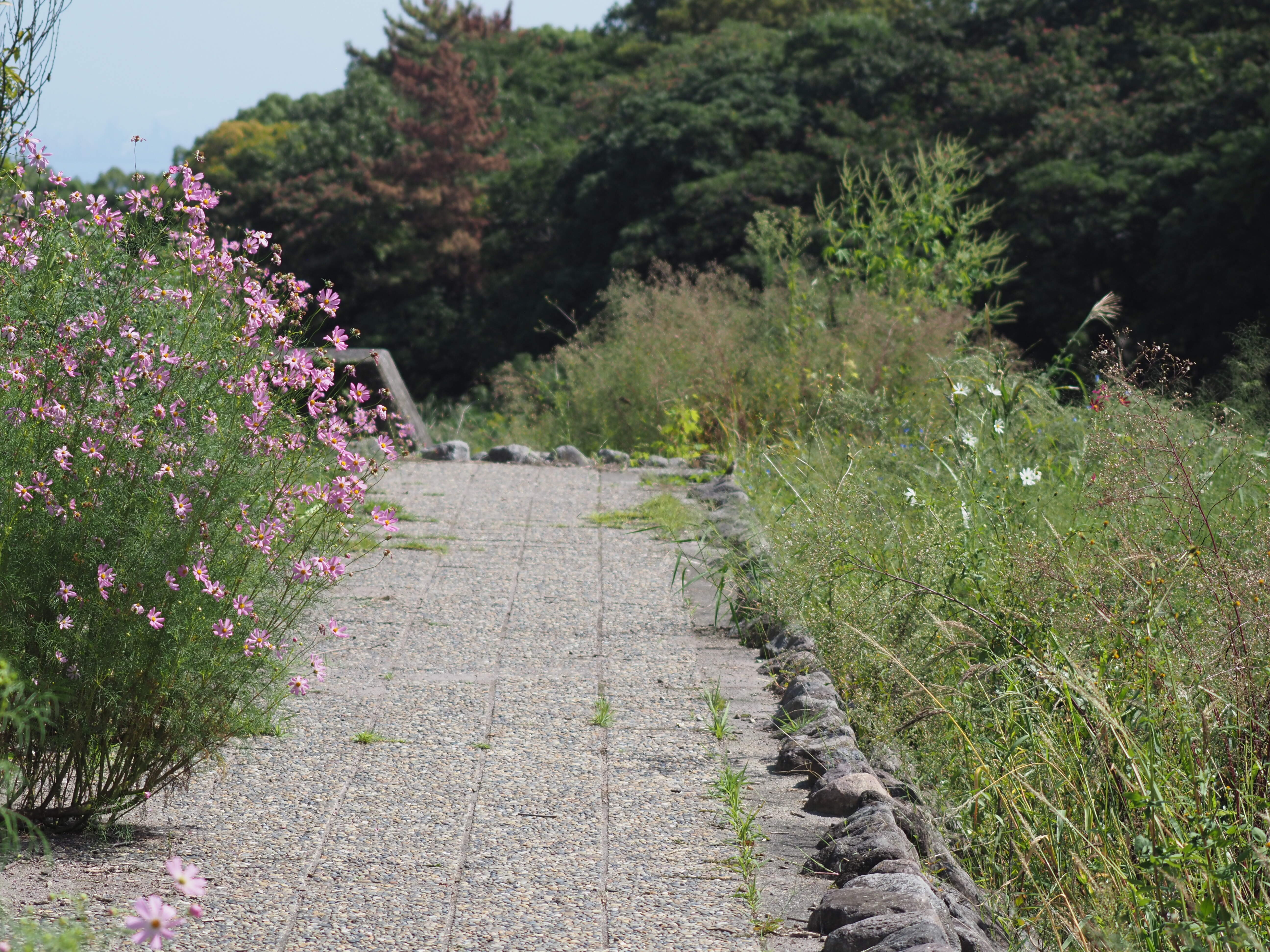 キバナコスモス地帯を離れ河川敷の左岸を下流へ向かいます。 近くからセキレイの鳴き声が聞こえますが、姿は見えません。