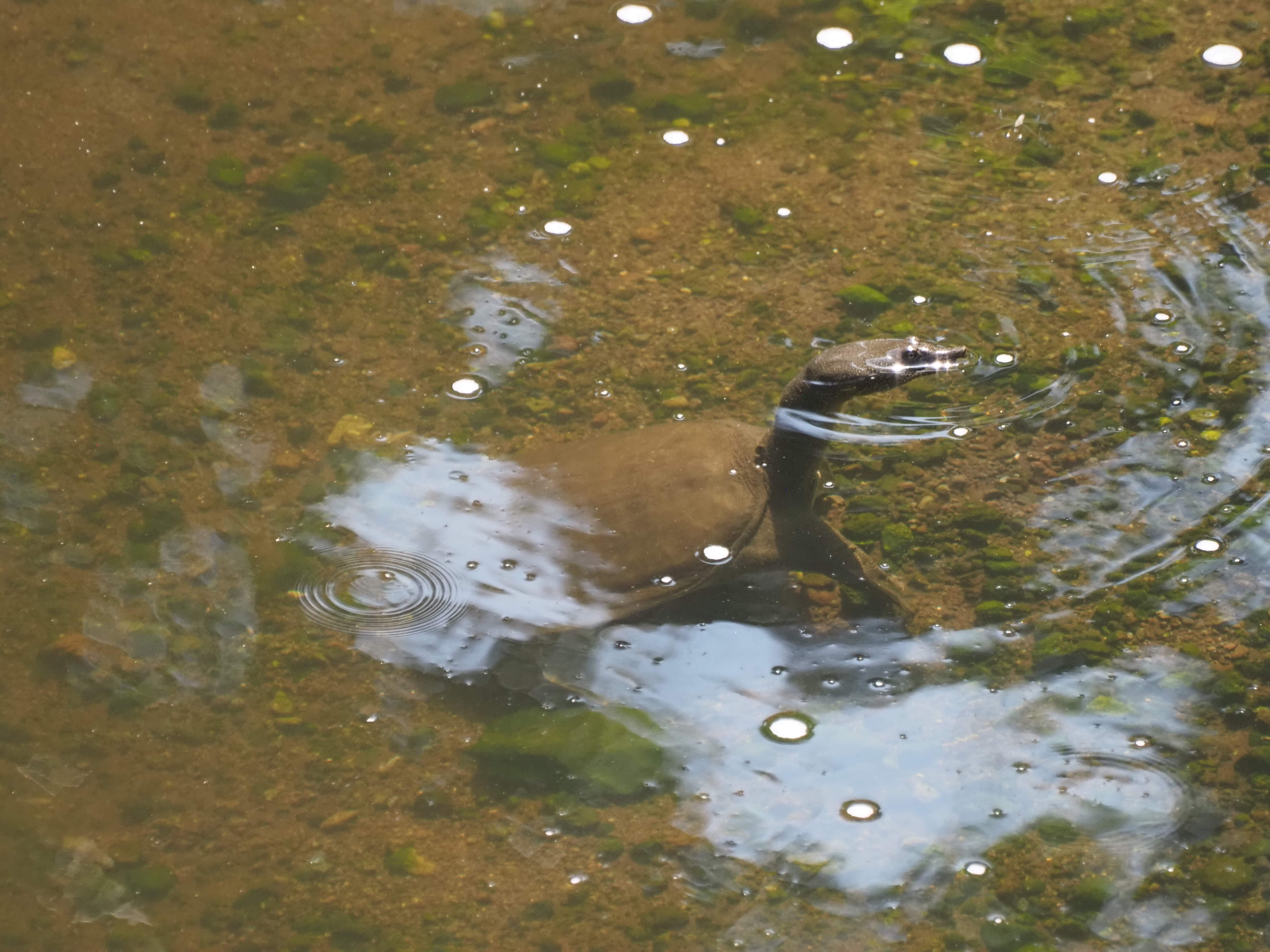 その先の砂防ダムではスッポンが出迎えてくれました。 いつもは遠くからこちらに気づいて水中に逃げるのですが、今日はまだ気づいていません。 おかげで水面から顔を出しているところを撮影できました。
