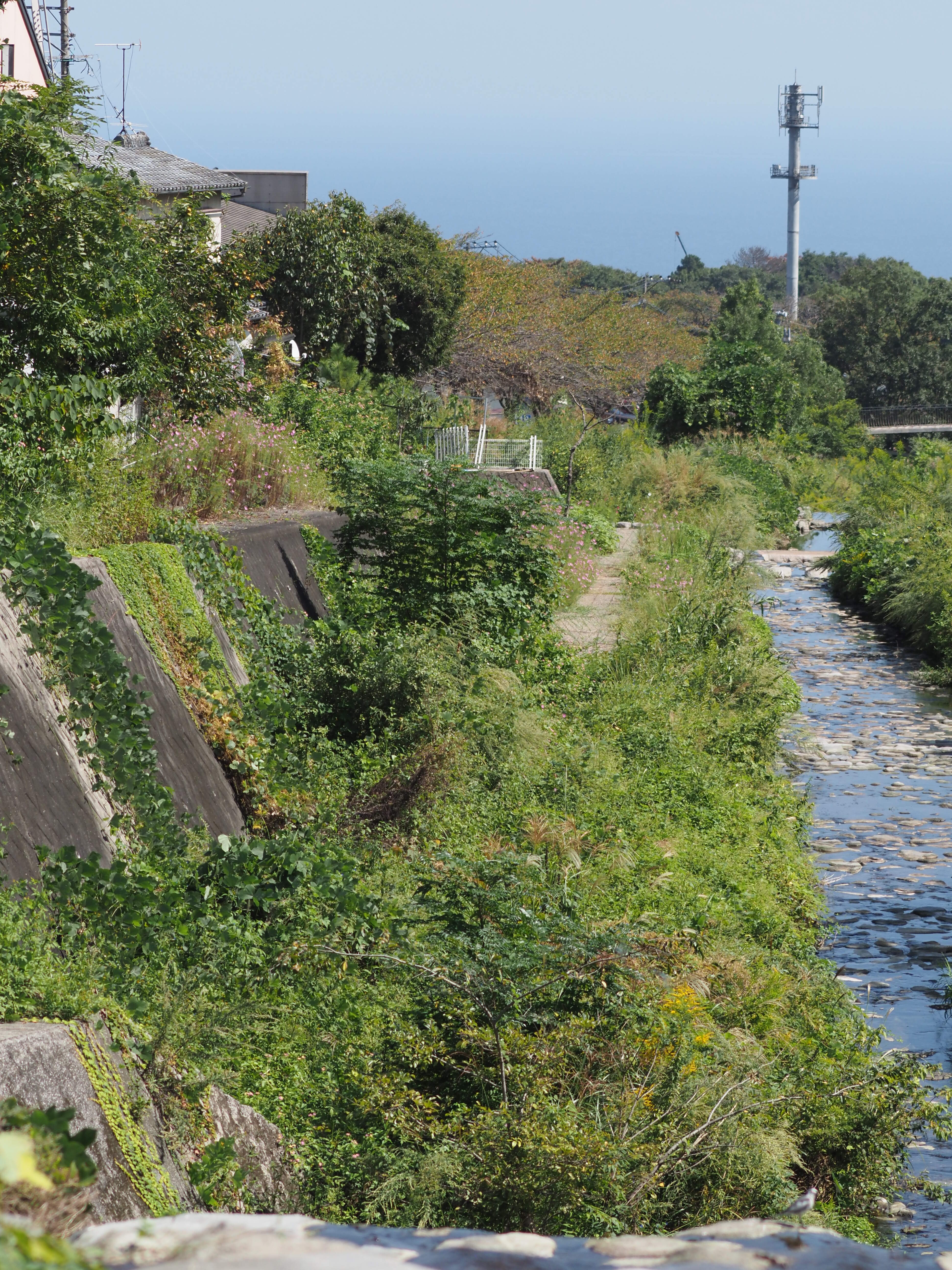 境川(別府市) 古戦場橋の下の左岸はつる性植物で覆われている画像を拡大する