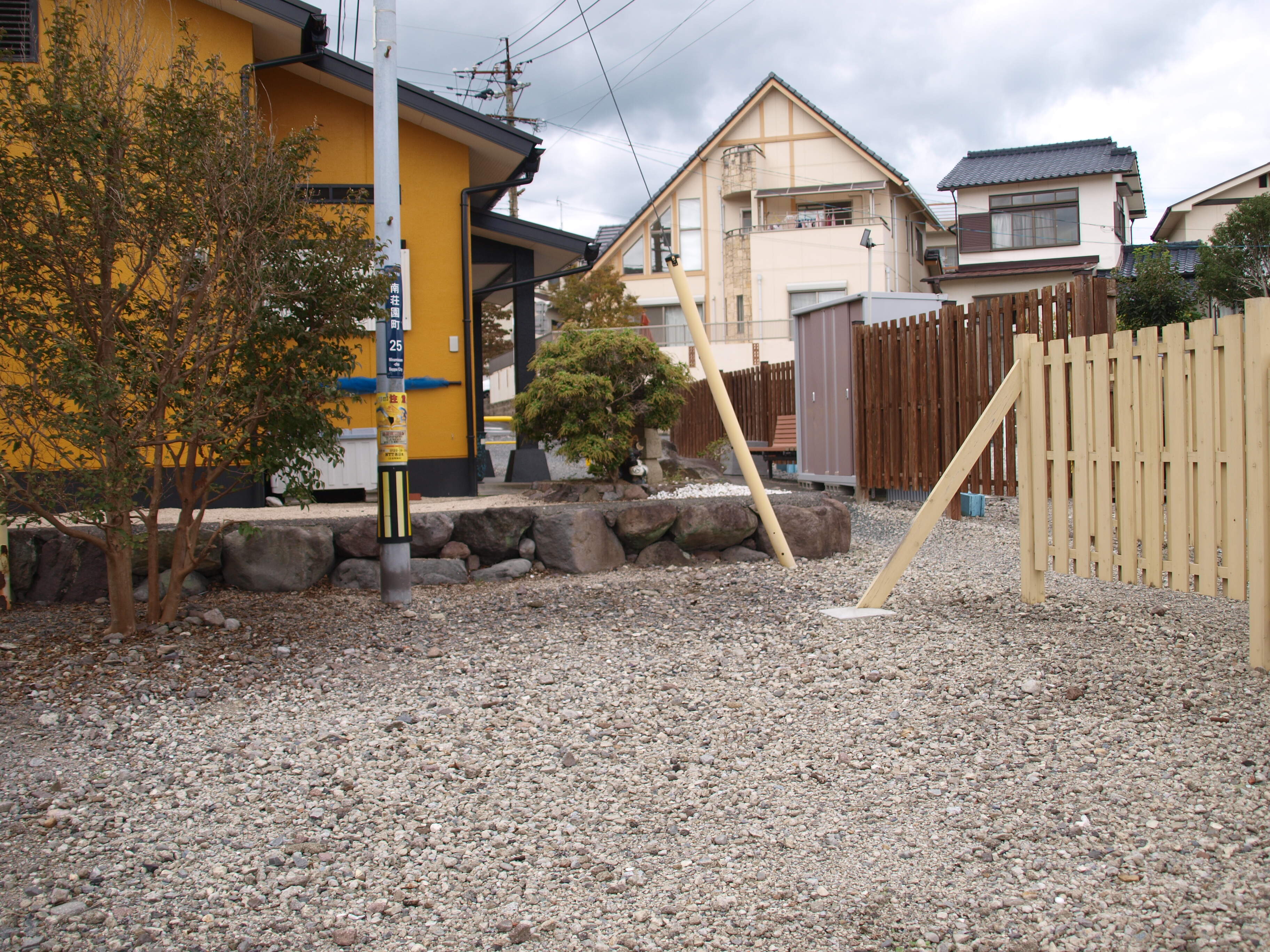 六角温泉を横目に "であい橋" へ向かっているときのこと。 ふと六角温泉の入口を見ると、なんと小さなタヌキの置物が置いてあるじゃないですか。 先生にはジュニアがいらっしゃったんですね、存じ上げなかったです。
