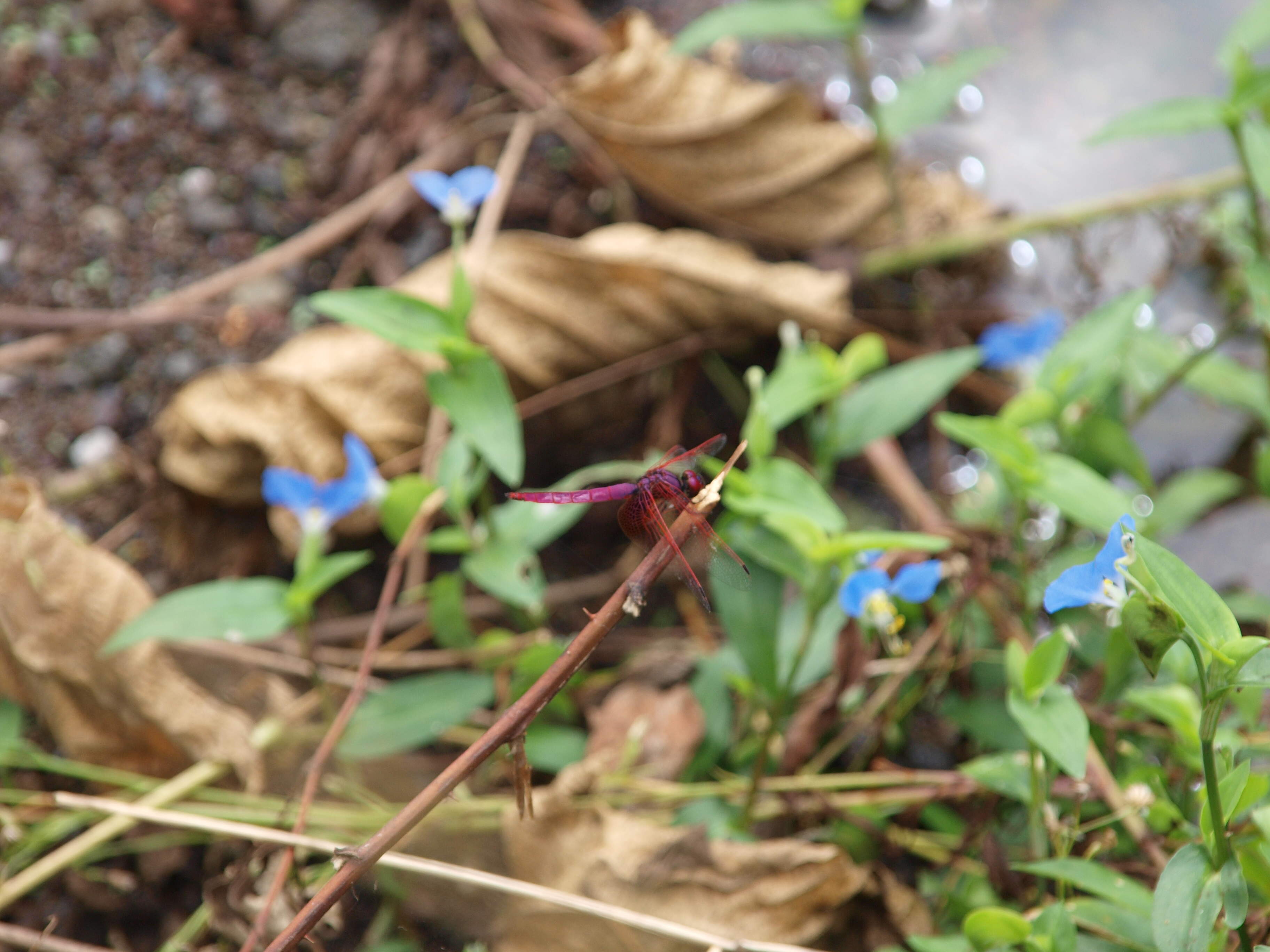 その少し上流では連結産卵するハラボソトンボと出会いました。 トンボは種類によって水面に産卵したり、草の茎に産卵したりと違いがあるそうです。 ハラボソトンボは草に産卵するんですね。