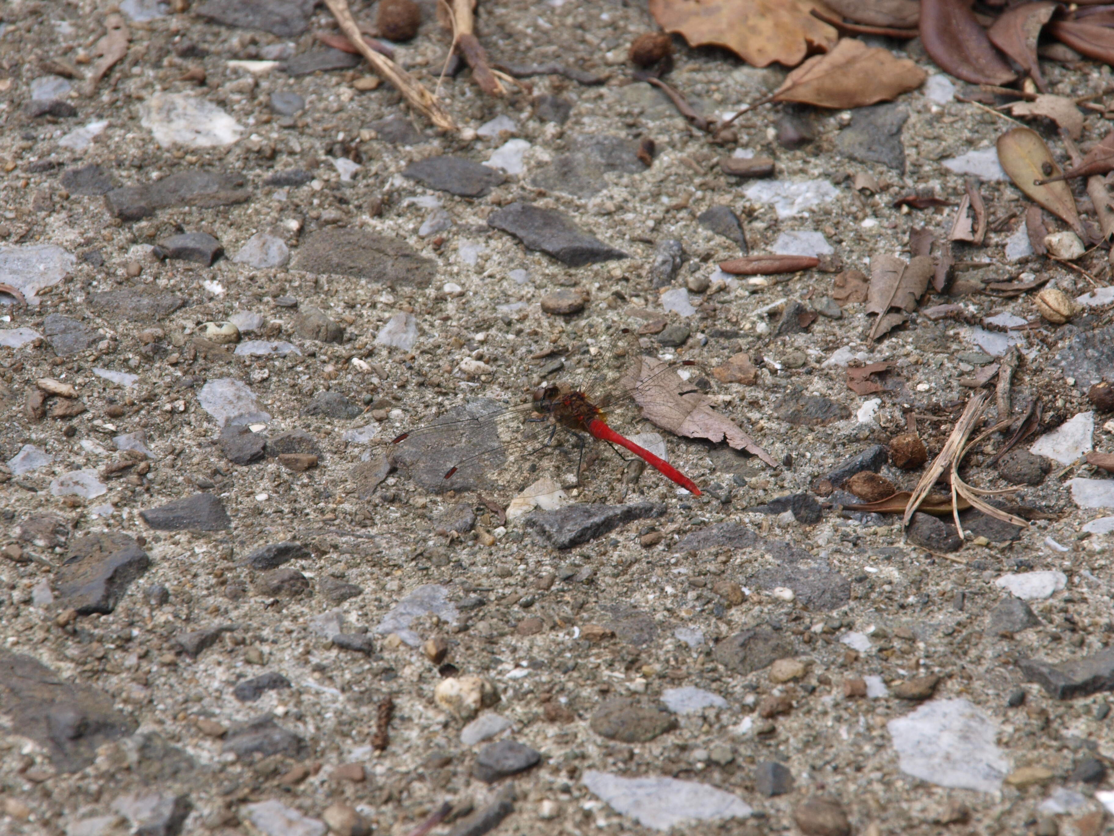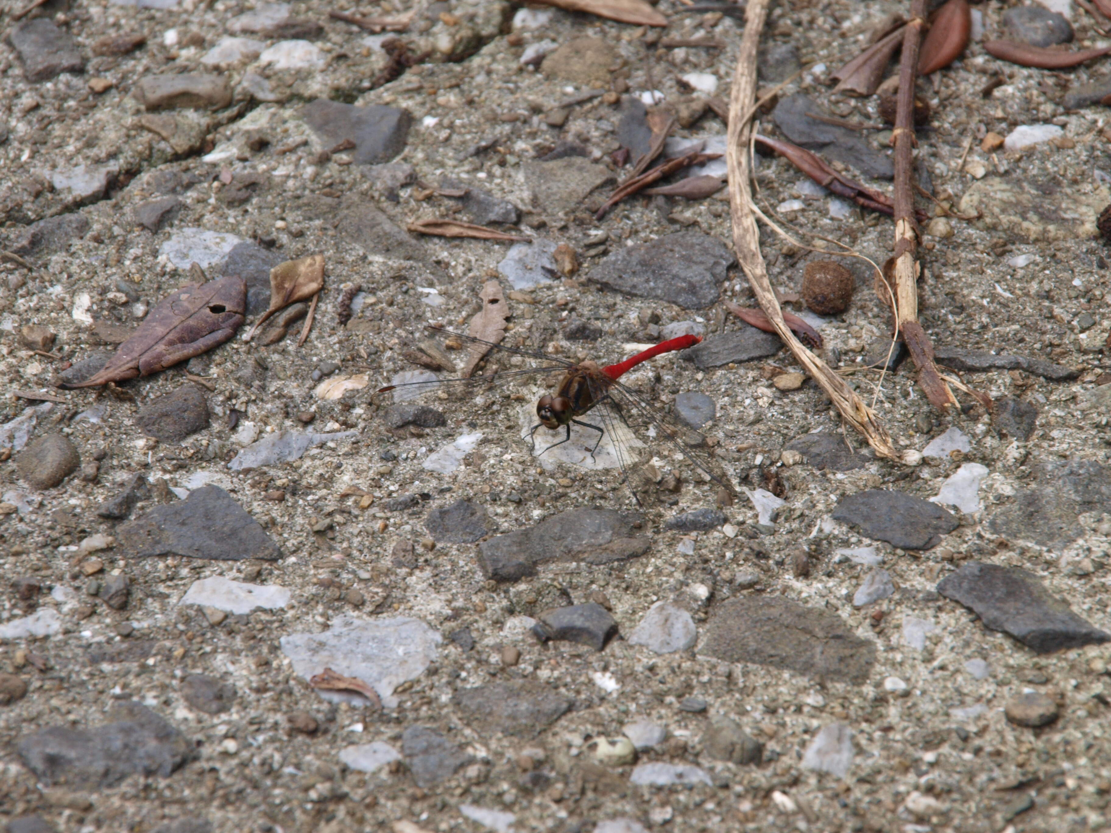 南立石公園への階段の途中でのこと、マユタテアカネが地面に止まりました。 マユタテアカネは小型のトンボですが、コイツは特に小さく見えます。 眉斑が見たいから、こっち向きに止まって欲しかったです。