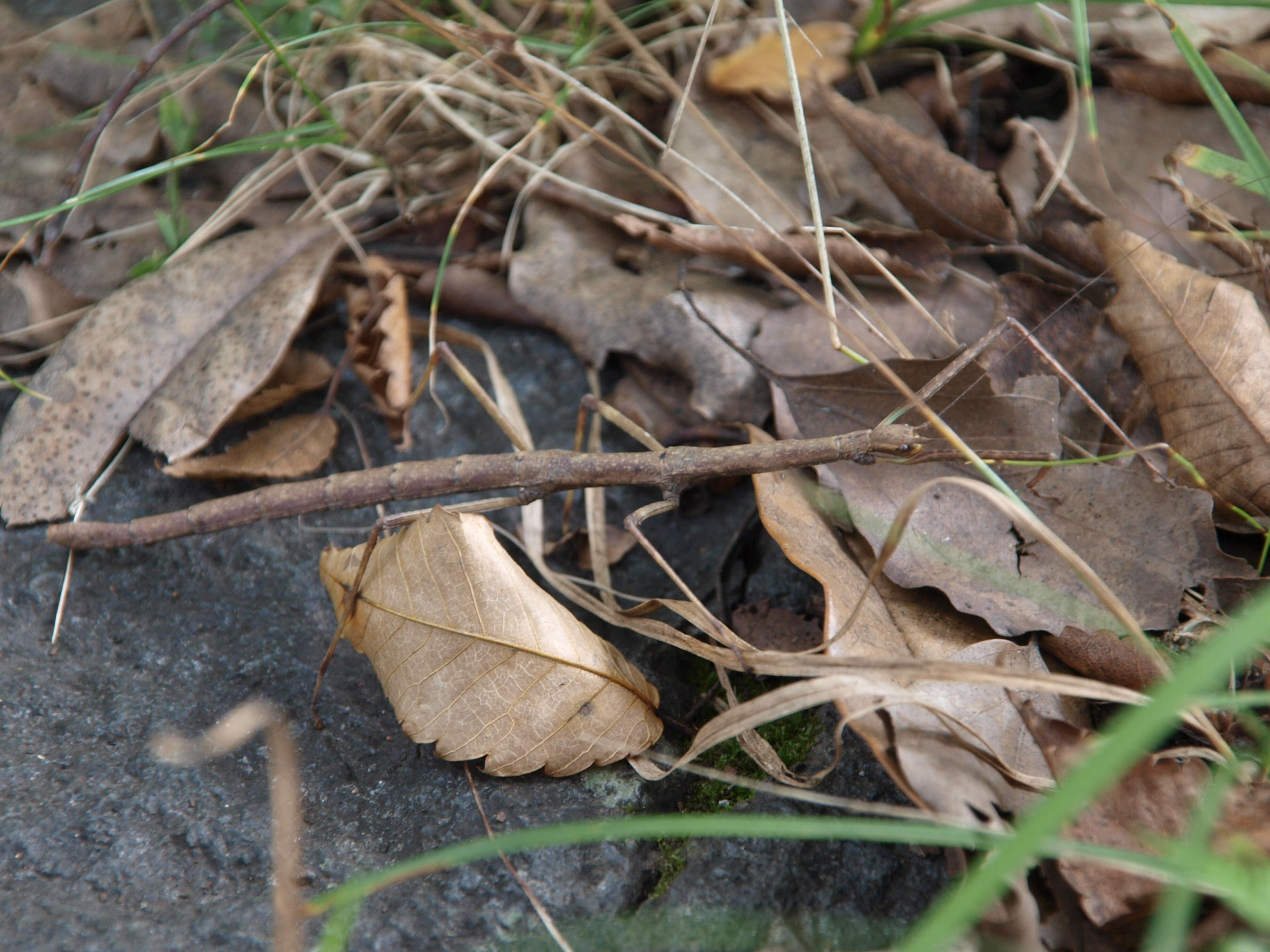 目の前の地面で何かが動いています。 見ると木の枝が不自然に動いていますが、近くに昆虫などはいません。 お、よーく見るとナナフシじゃないですか。 ナナフシを撮影するのも生で見るのも人生初のように思います。