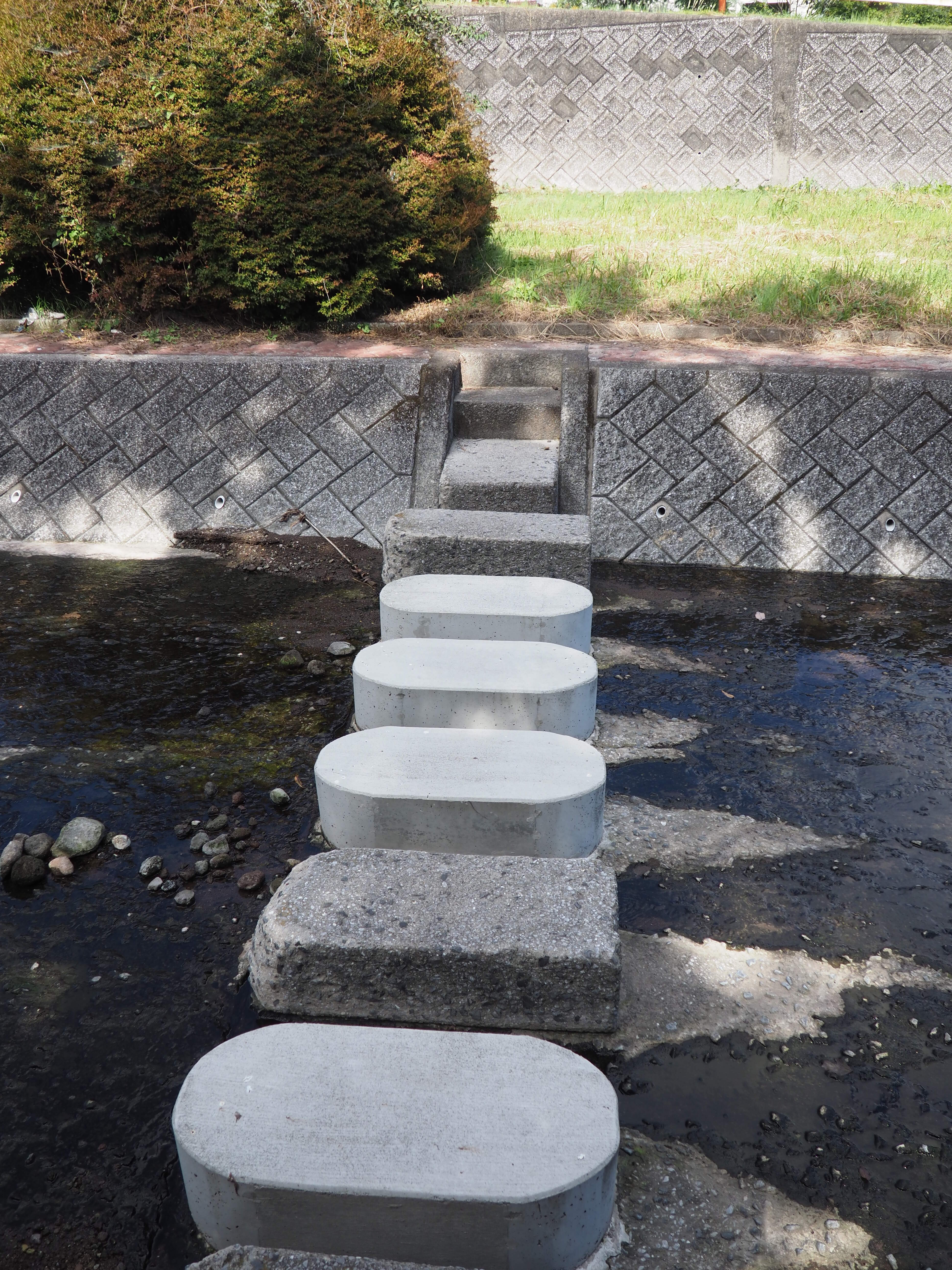 境川(別府市) 飛び石で右岸へ渡って階段で土手上の遊歩道へ画像を拡大する