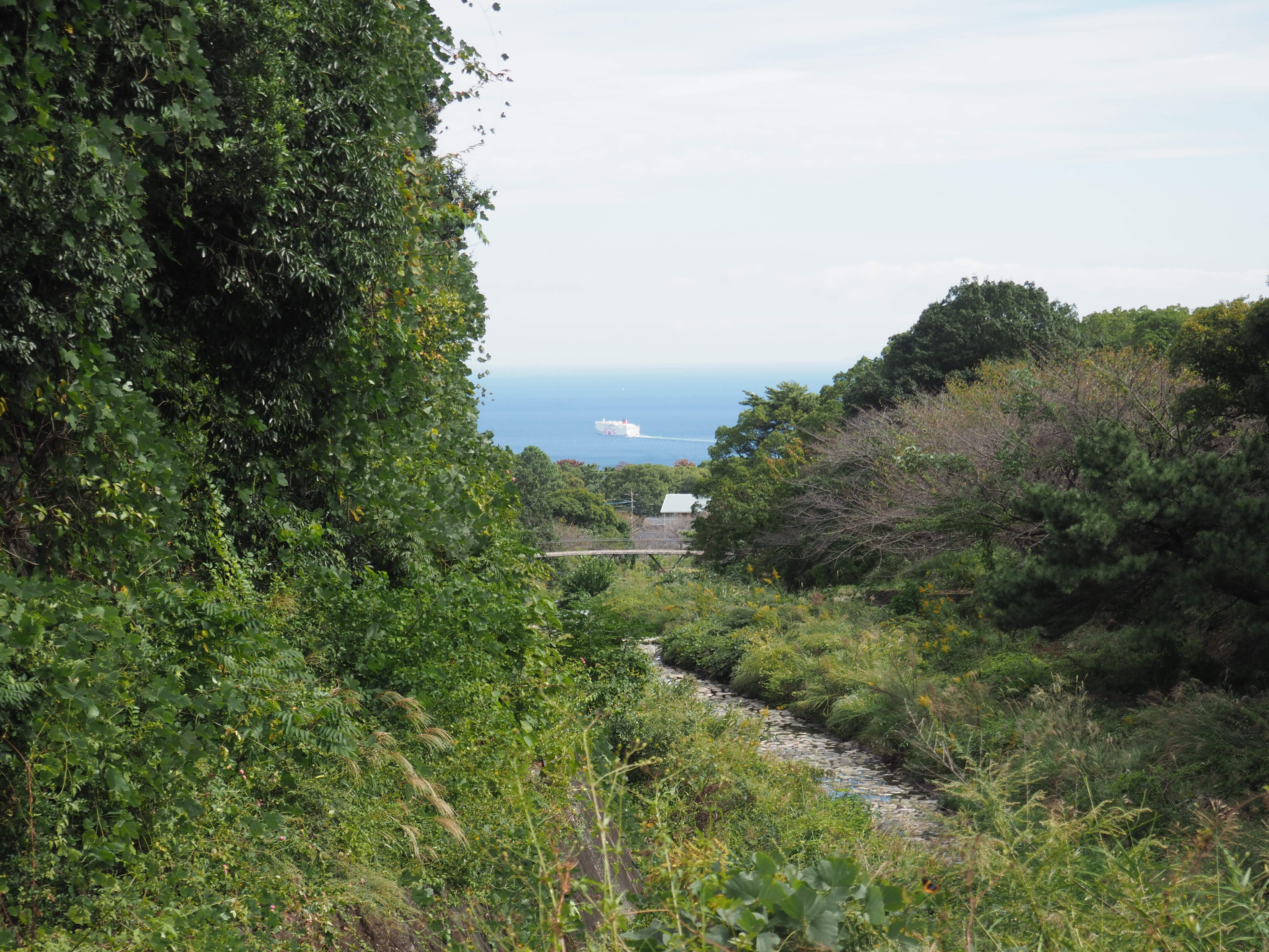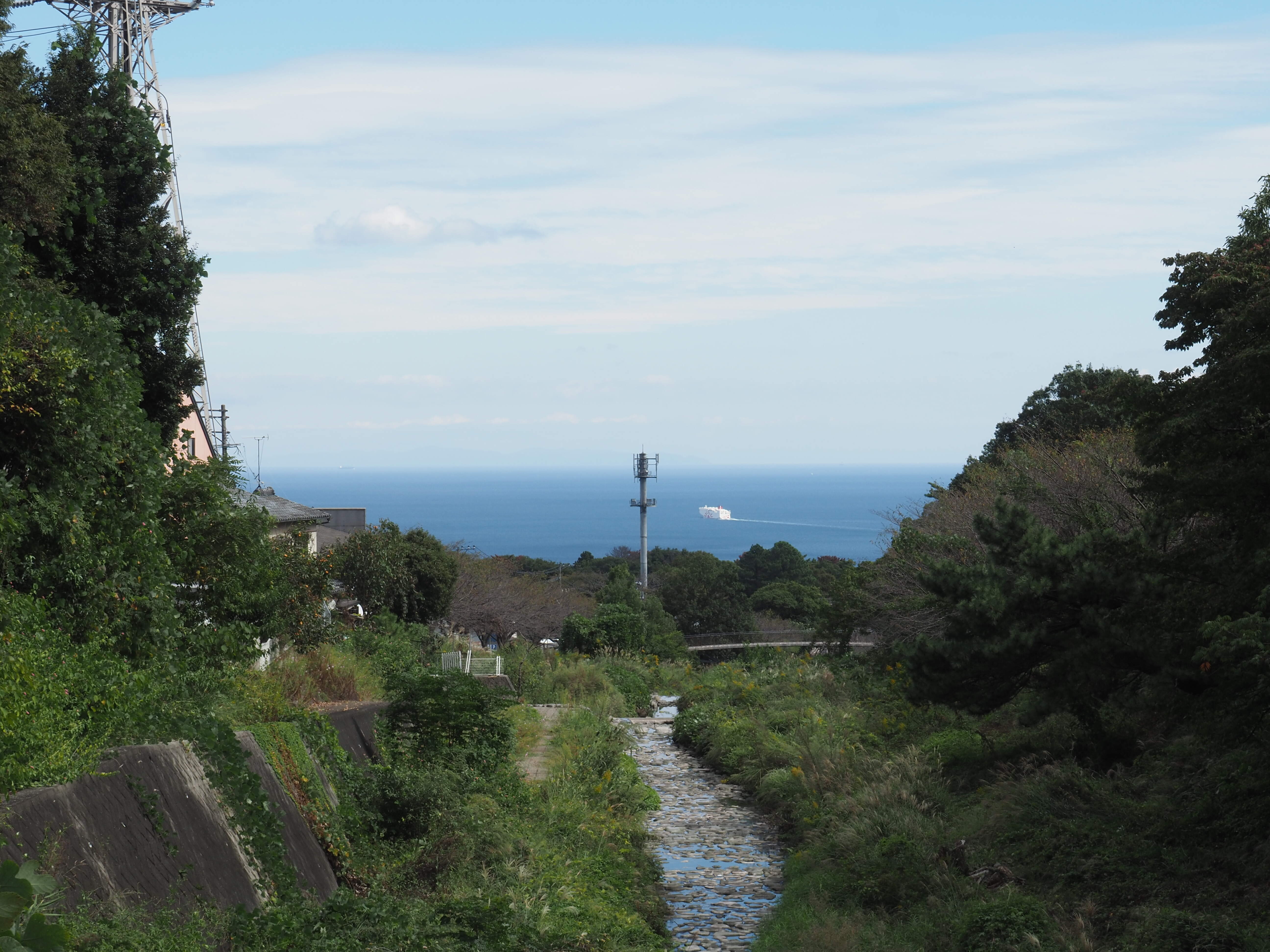 2つ砂防ダムを越えるとイナコスの橋が見えてきます。 その先の別府湾にはフェリー "さんふらわあ" が見えます。 また、見づらいですが四国がそれなりに見えています。