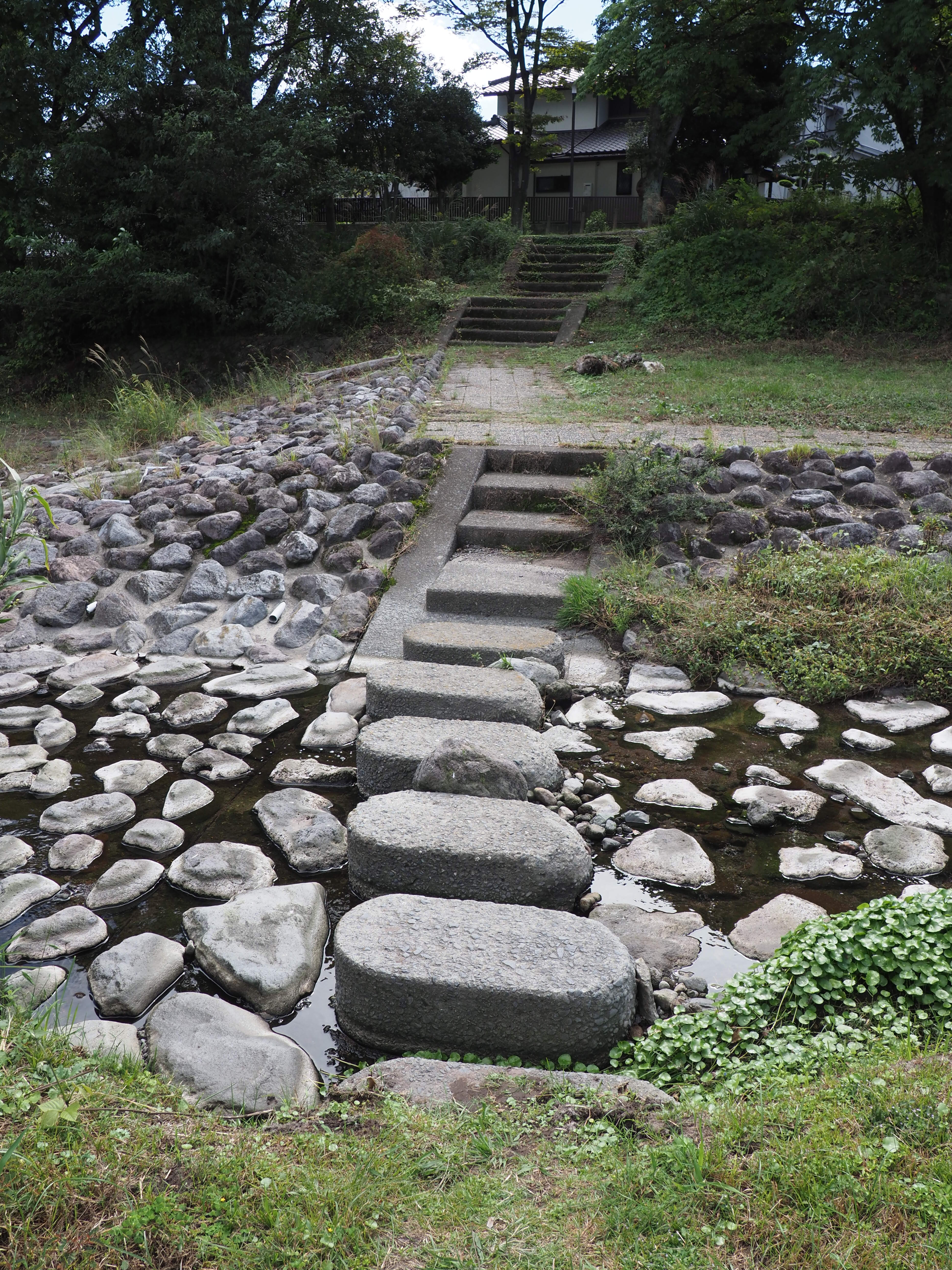 境川(別府市) 飛び石で右岸へ渡って階段で土手上の遊歩道へ