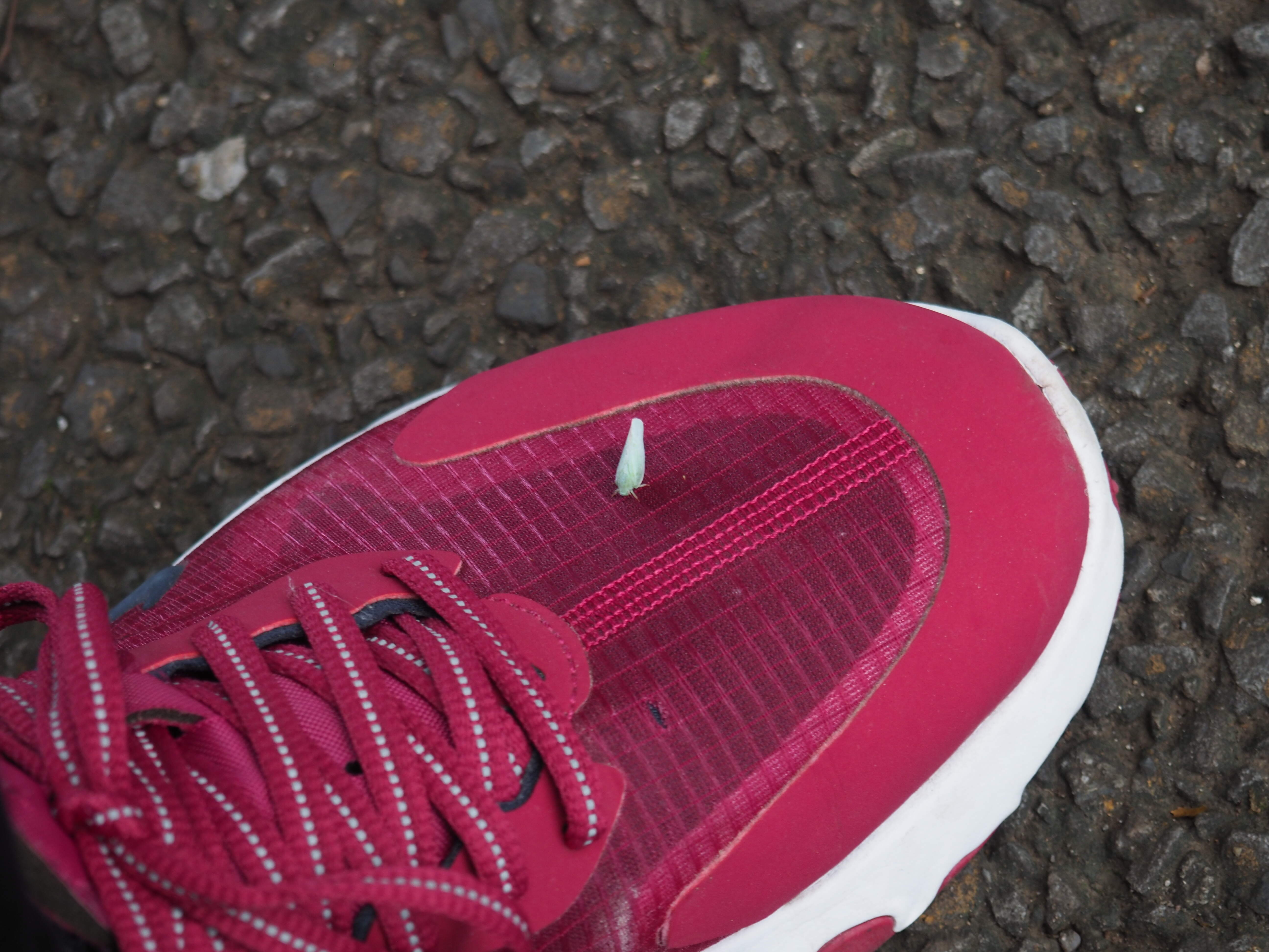 小さな昆虫が靴に止まりました。 しかも、靴を動かしても逃げません。 お、初撮影のアオバハゴロモです。