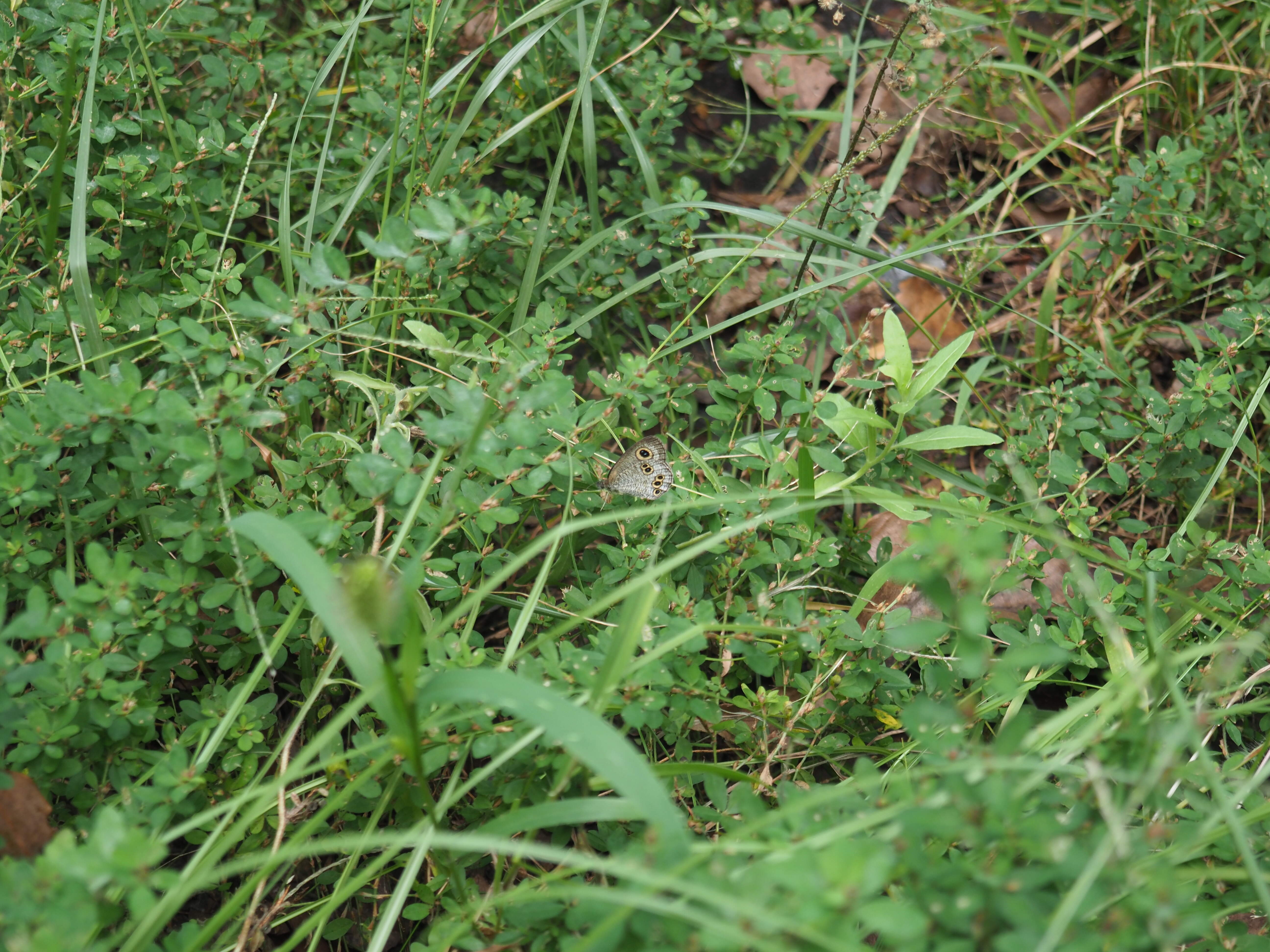 遊歩道を抜ける直前でのこと、小さな蝶が草に止まりました。 よーく見ると、久しぶりに見かけるヒメウラナミジャノメです。 約1年ぶり、2度目の遭遇です。 甲子園風に言えば。