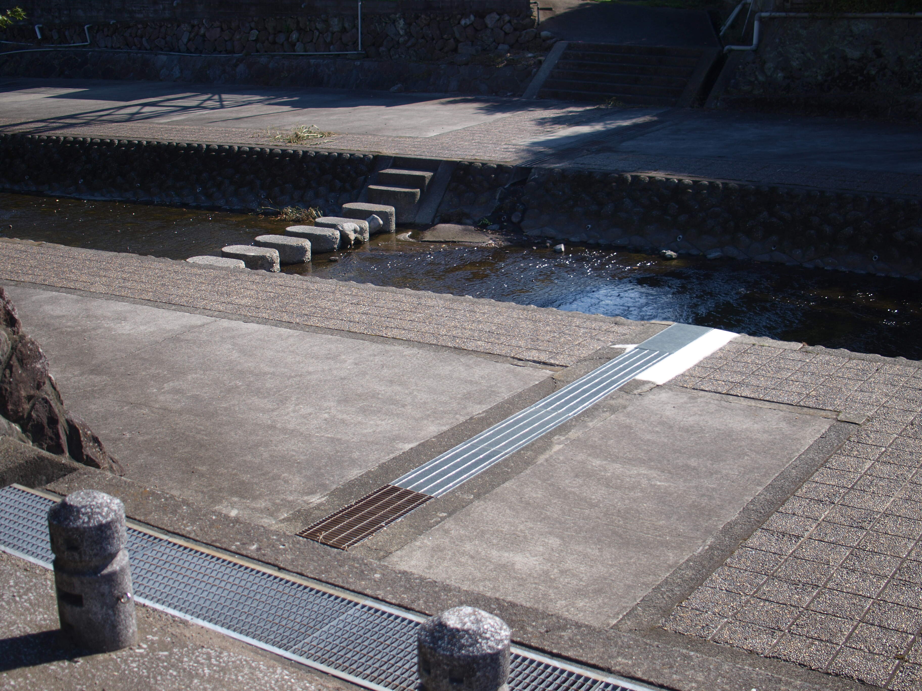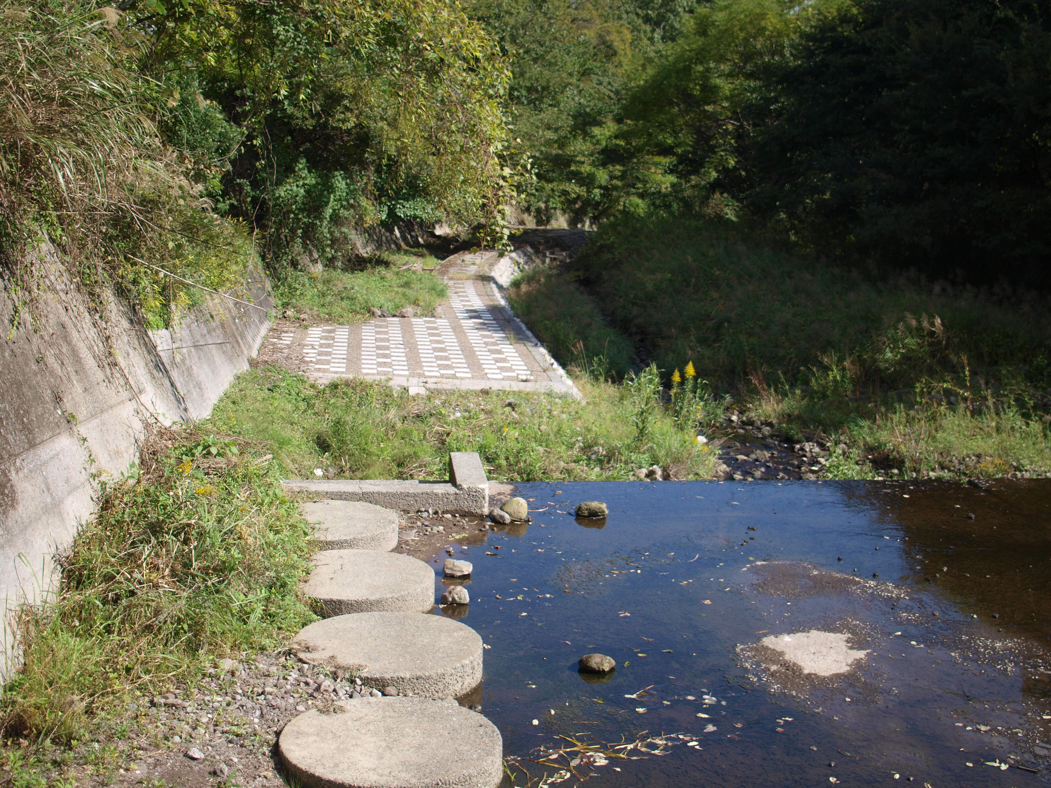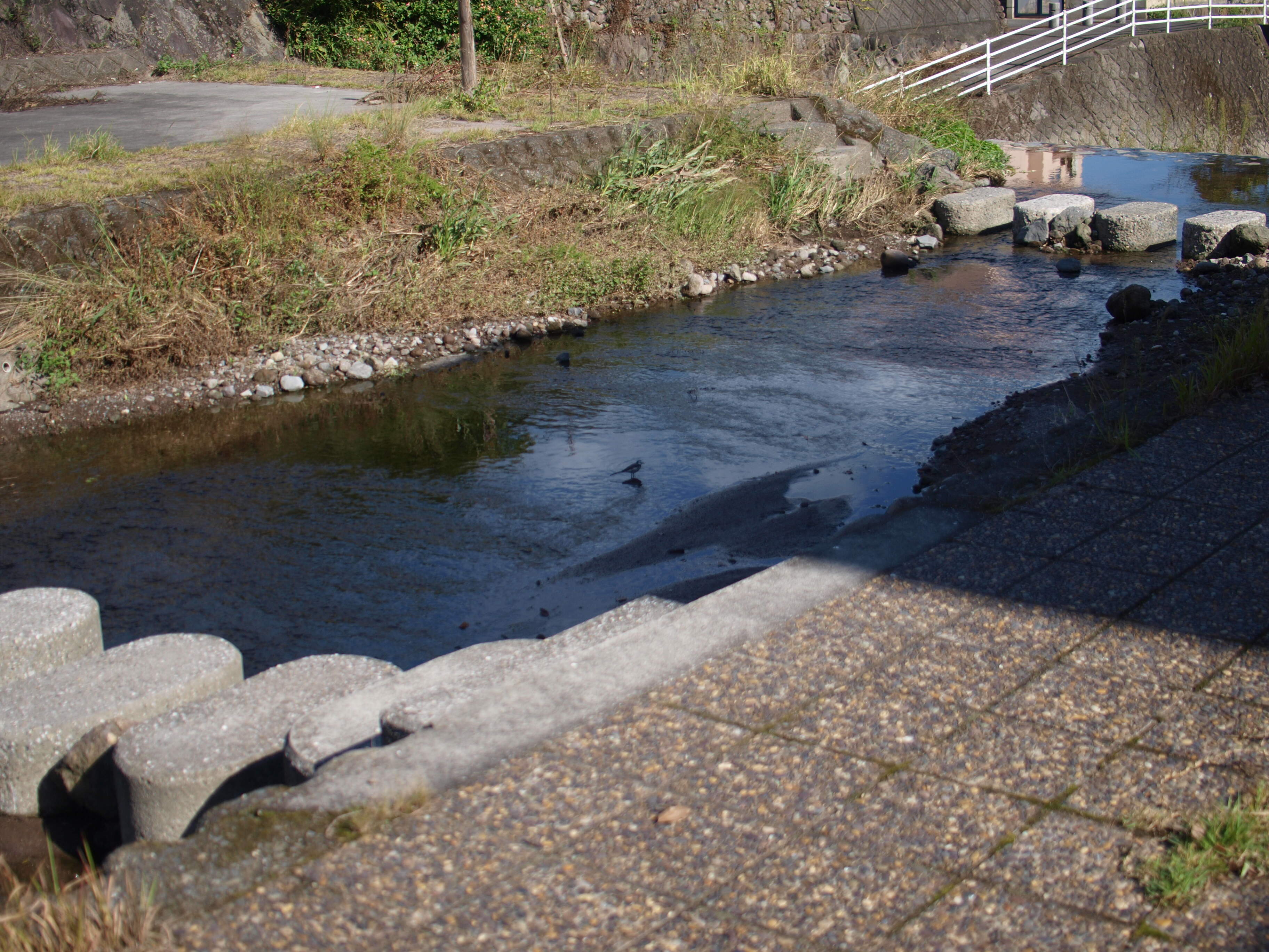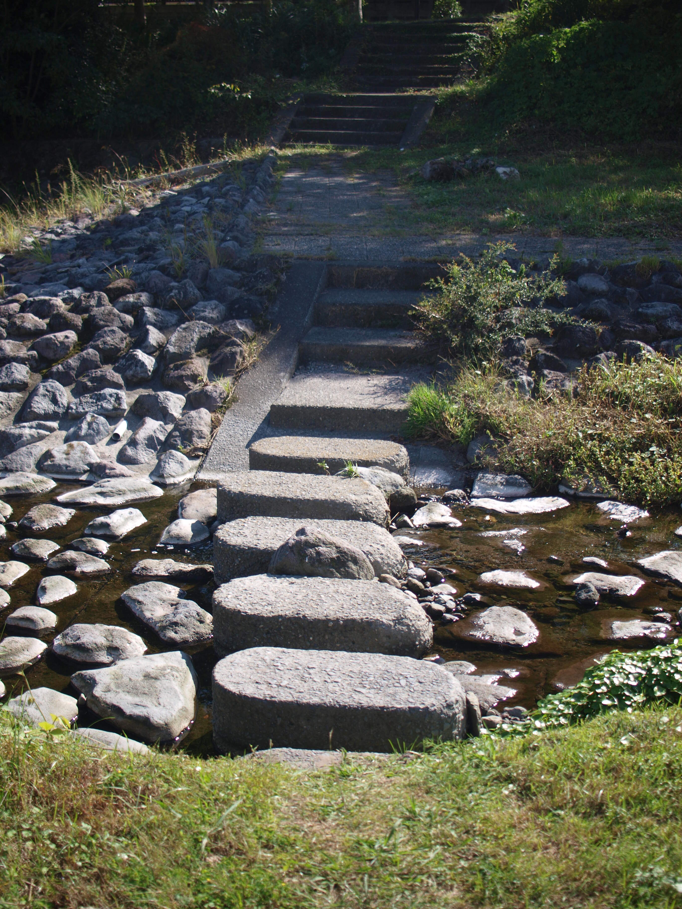 境川(別府市) 飛び石で対岸へ渡り階段で土手上の遊歩道へ画像を拡大する