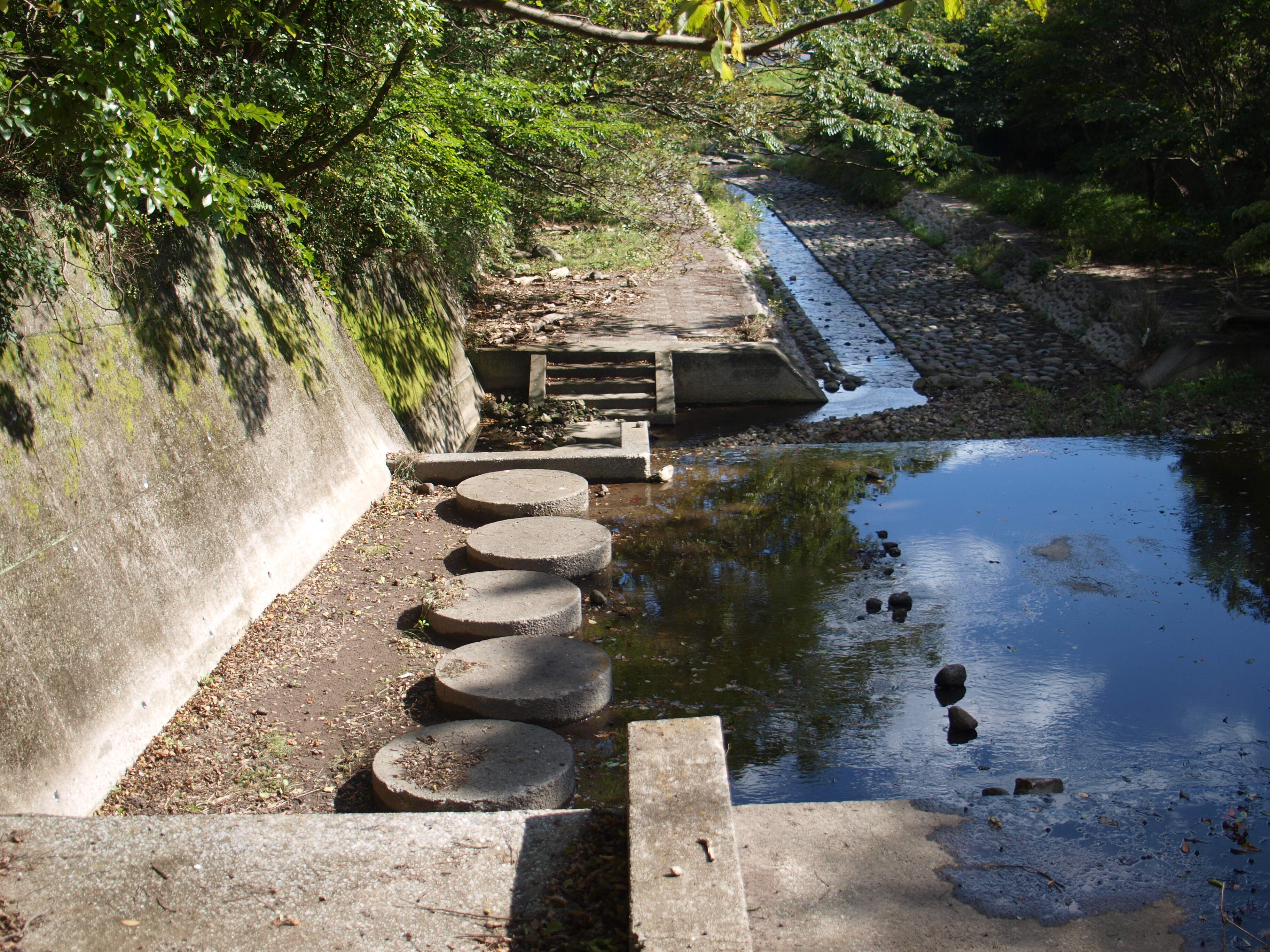 境川(別府市) 飛び石で対岸へ渡り階段で土手上の遊歩道へ
