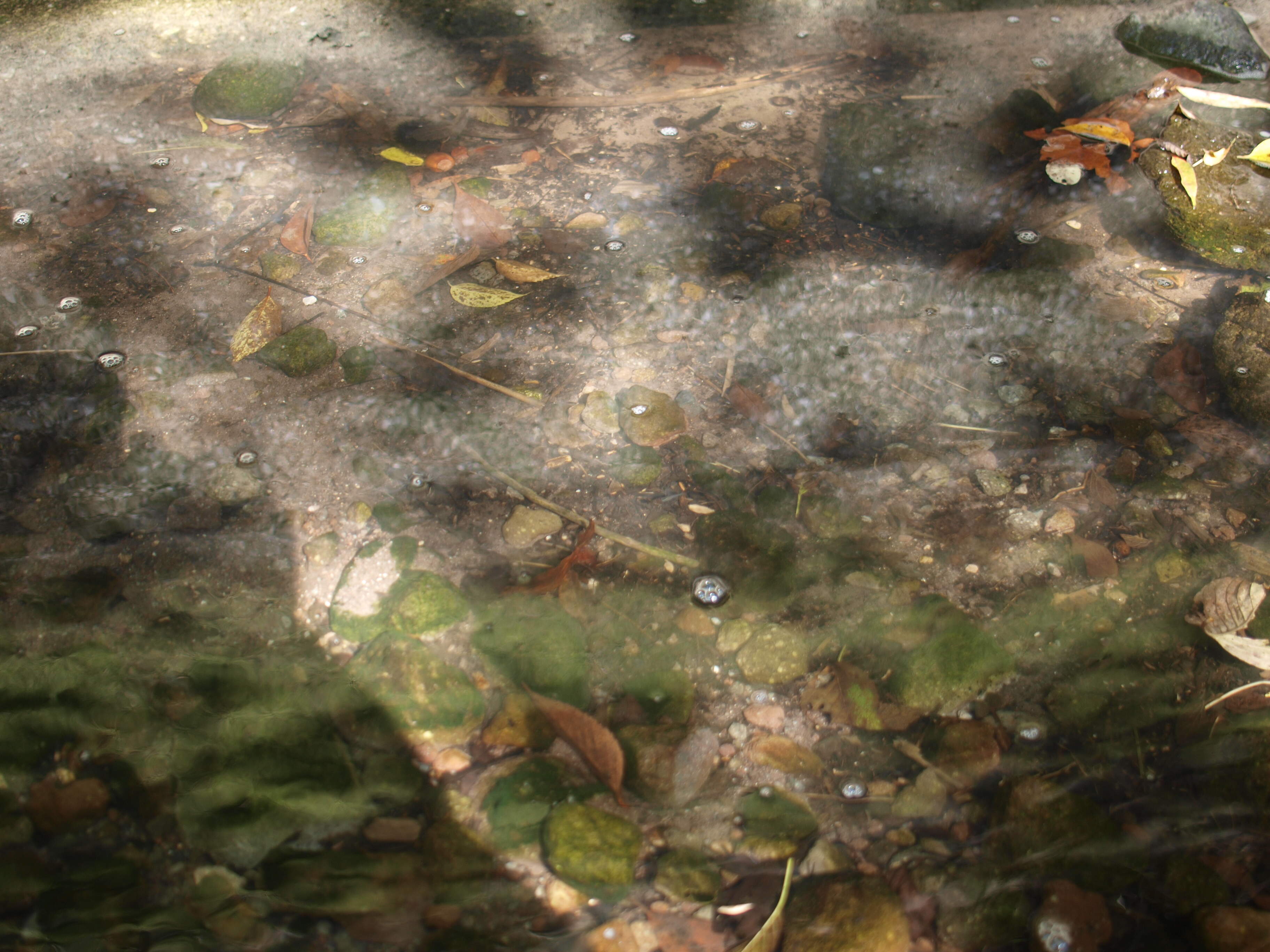 下段の四連の飛び石の周囲にも、カダヤシ疑惑の魚の群れがいます。 こちらの群れは、やや大きい個体の集まりのように見えます。