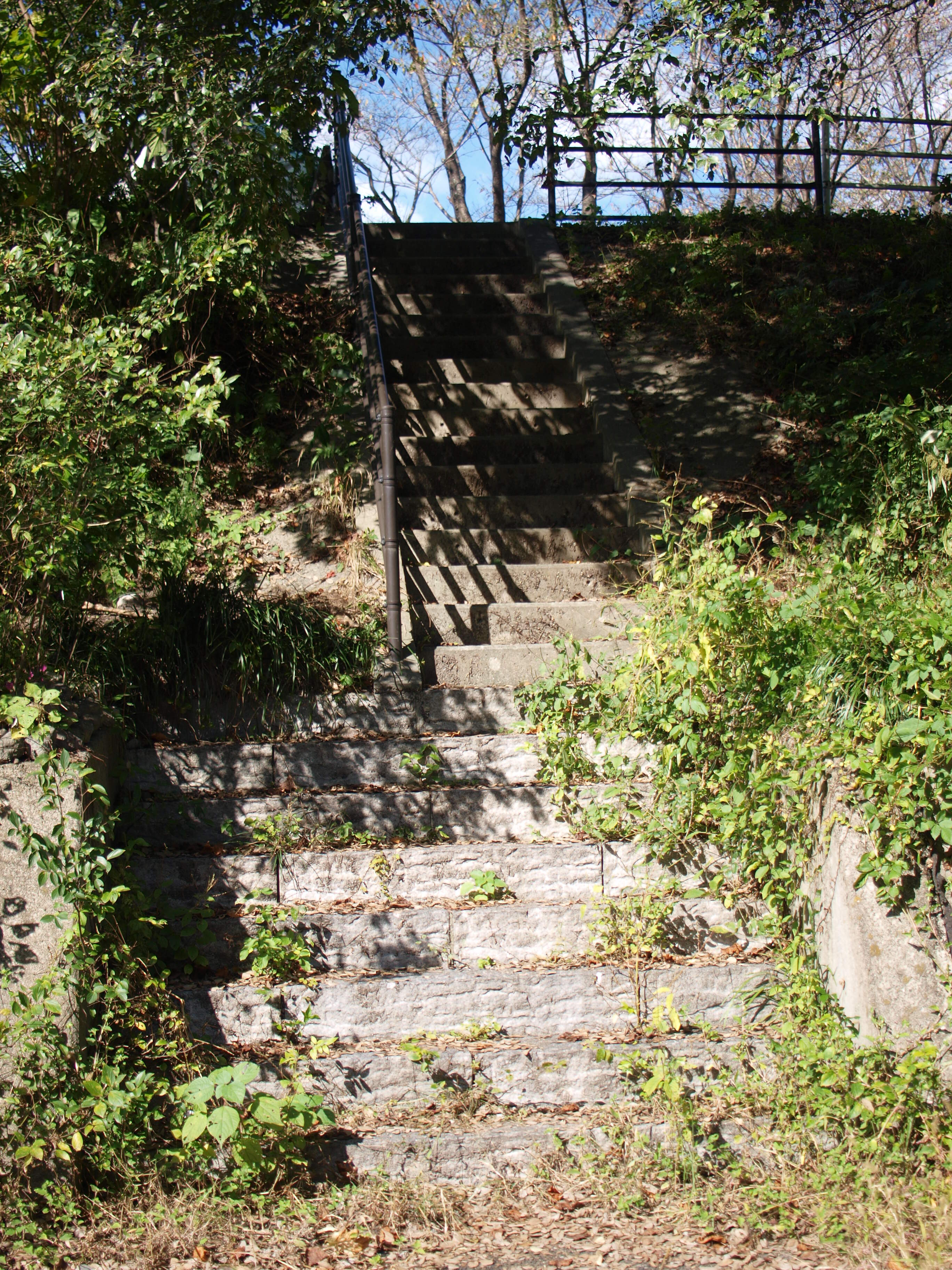 草地を少し進むと長い階段が現れます。 この階段を下ると河川敷へ戻ることができます。 なお、この階段の周囲では、過去に2回ほどクロコノマチョウを見たことがあります。