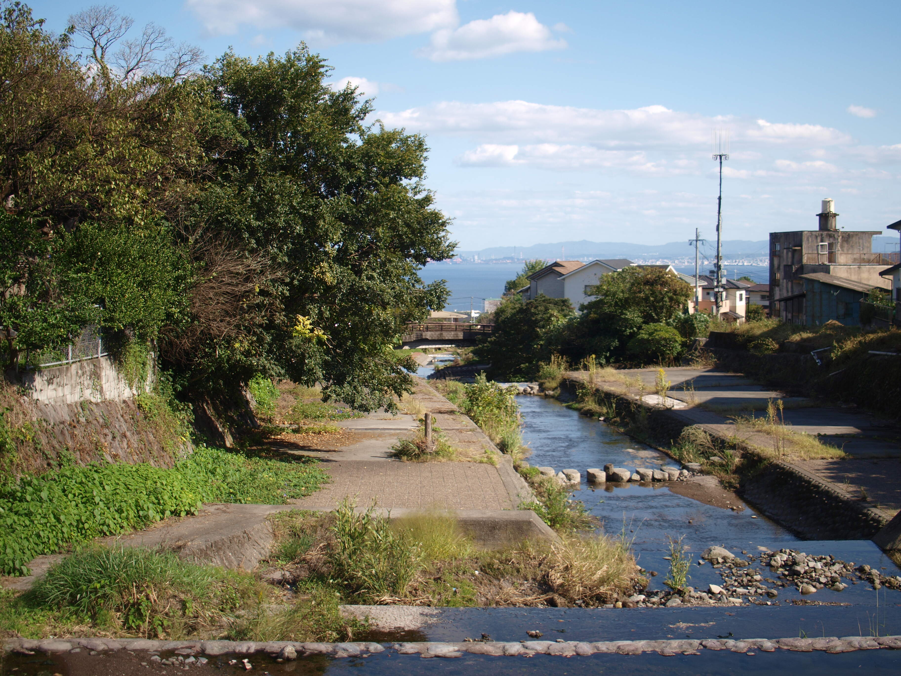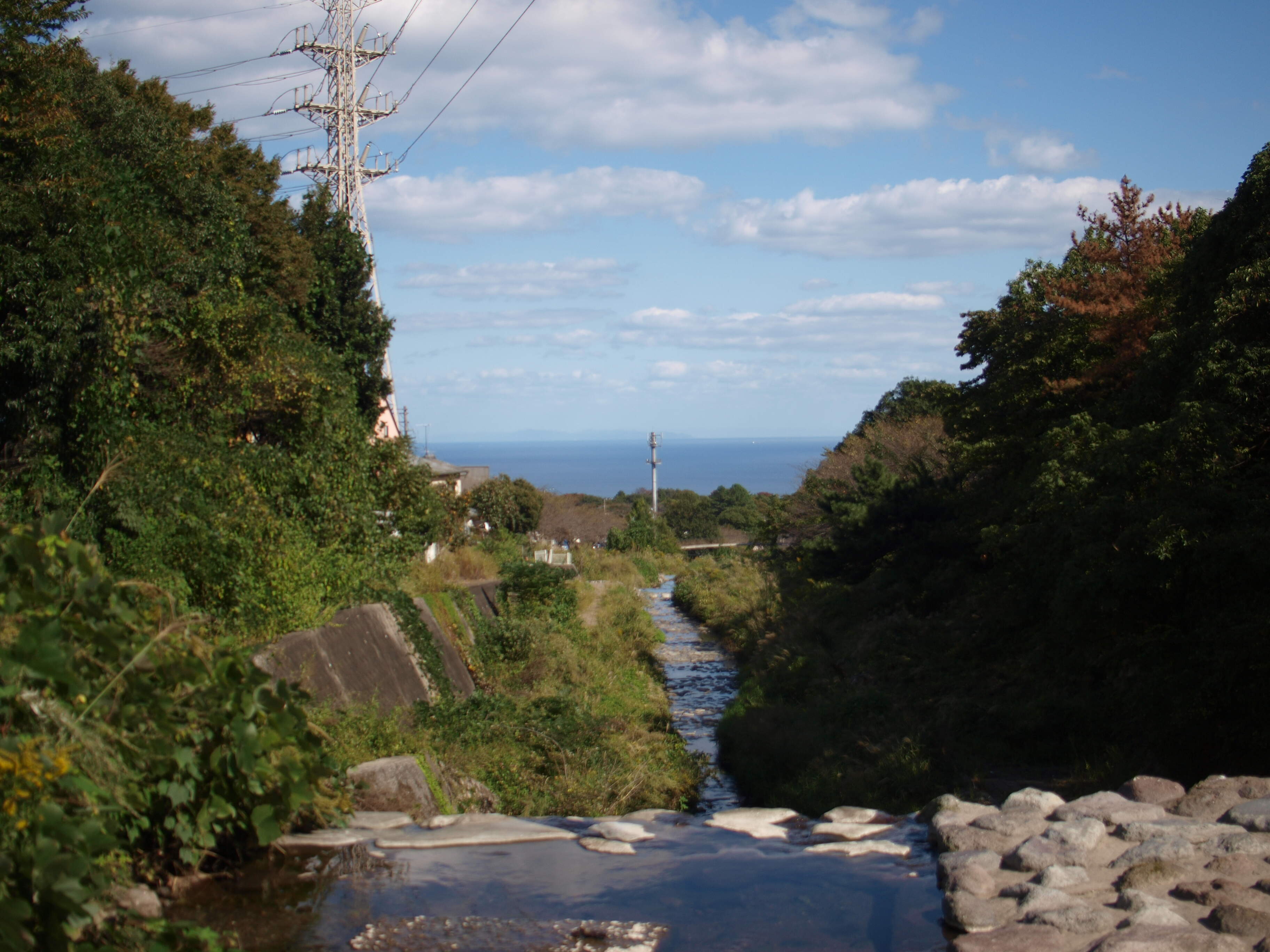 境川(別府市) 飛び石の途中から望む別府湾とその先の四国画像を拡大する