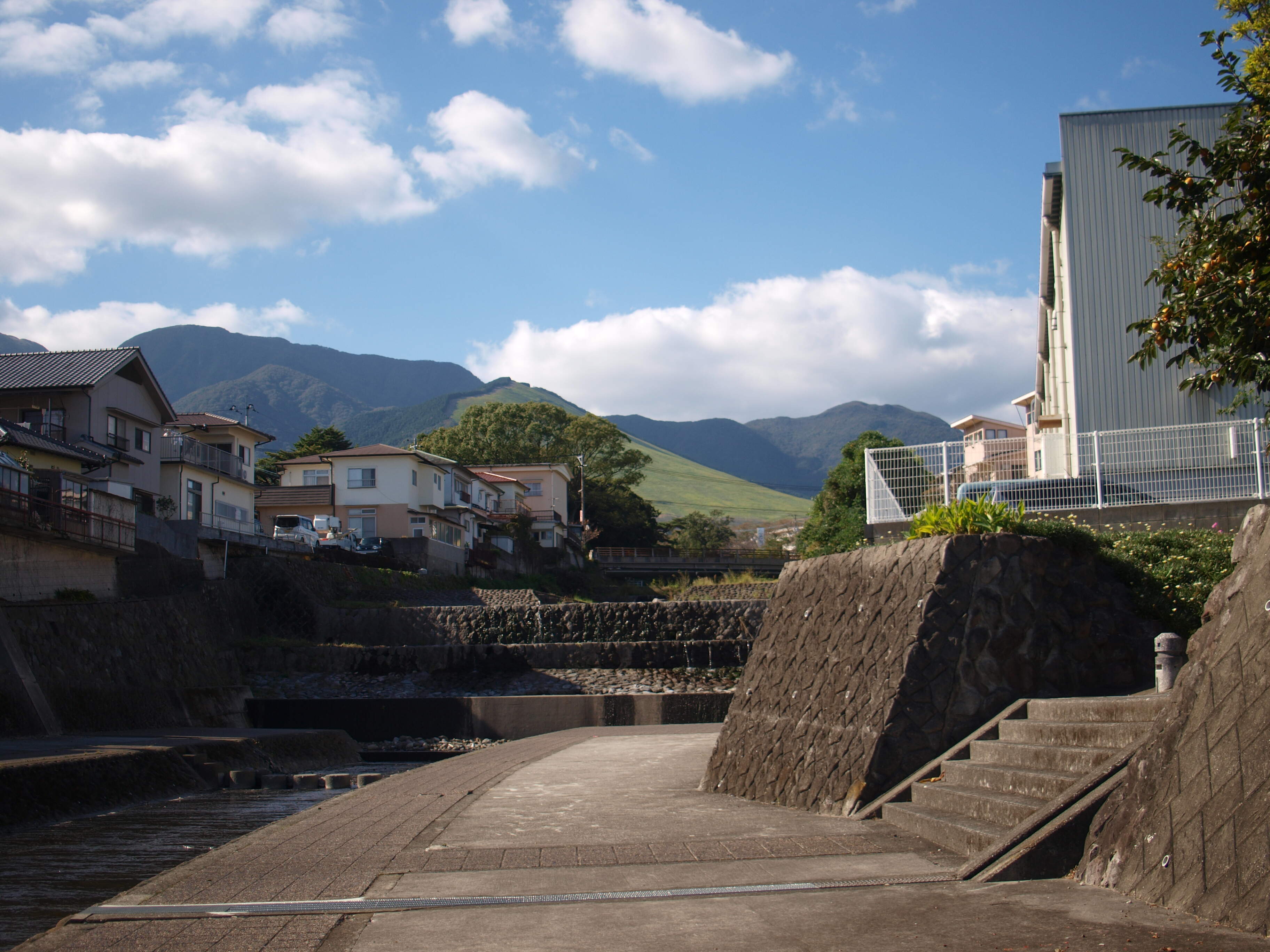 階段で河川敷へ下ります。 なお、この階段は "べっぷ鶴見岳一気登山道" のコースでもあります。
