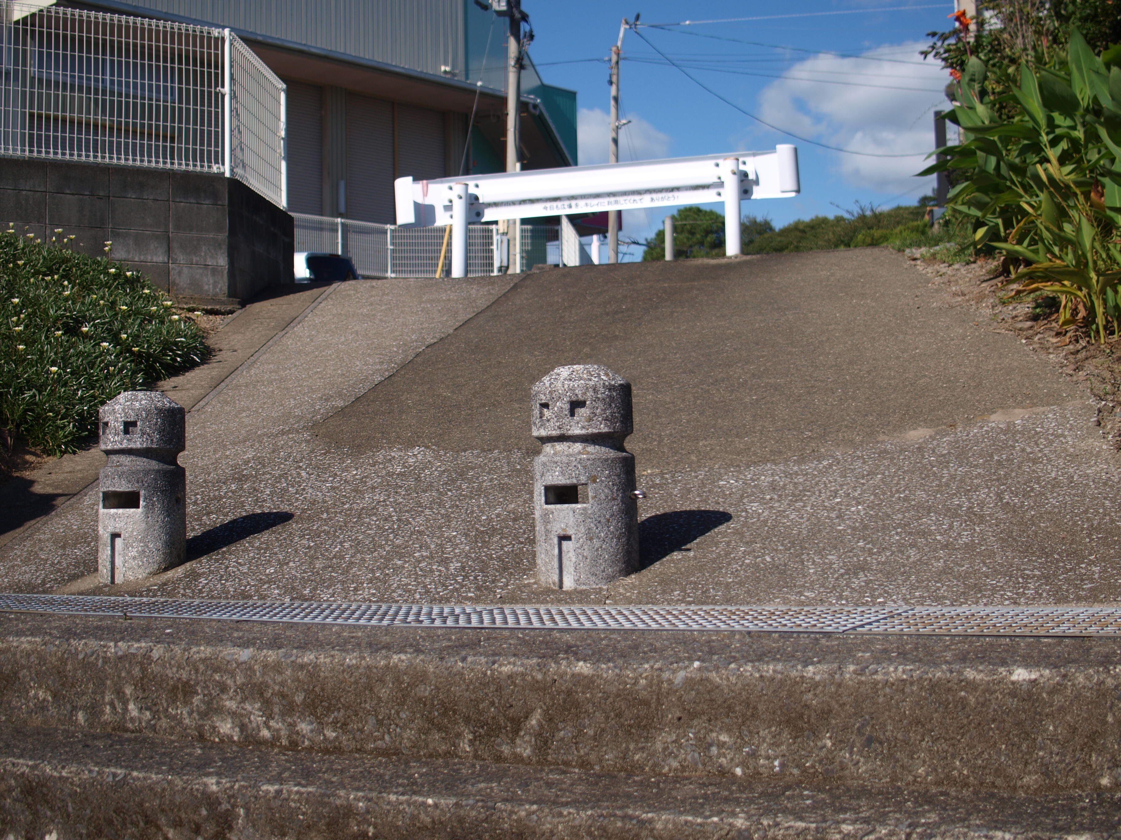 コスモス荘園店で飲み物を購入するため道路へ上がります。 笑顔のようにもロボットのようにも見える車止めが愛らしいです。