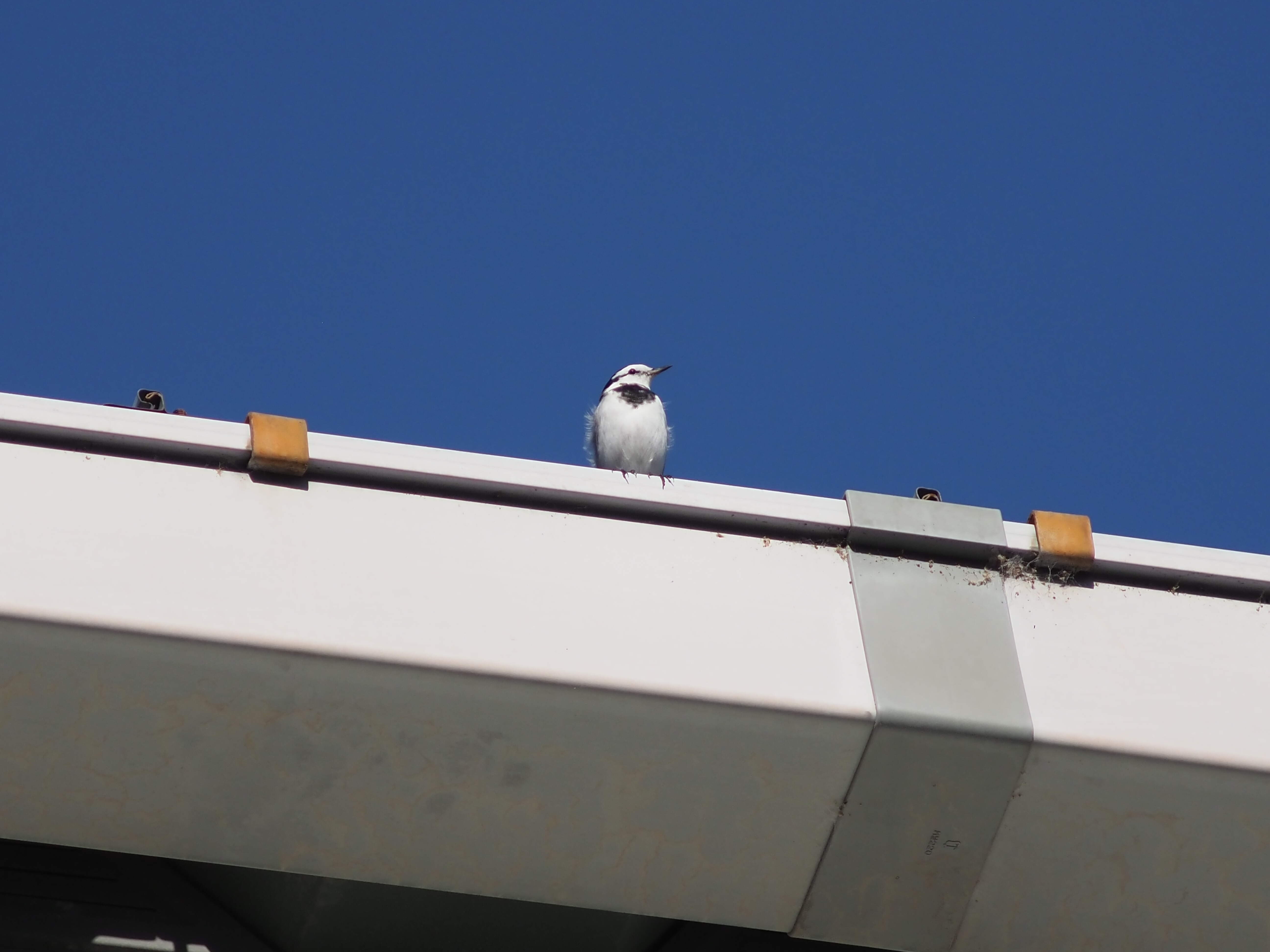 河川敷を歩きながらふと空を見上げると、コスモス荘園店の屋根に止まるセグロセキレイが目に入りました。 デジタルテレコンを有効にして激写します。