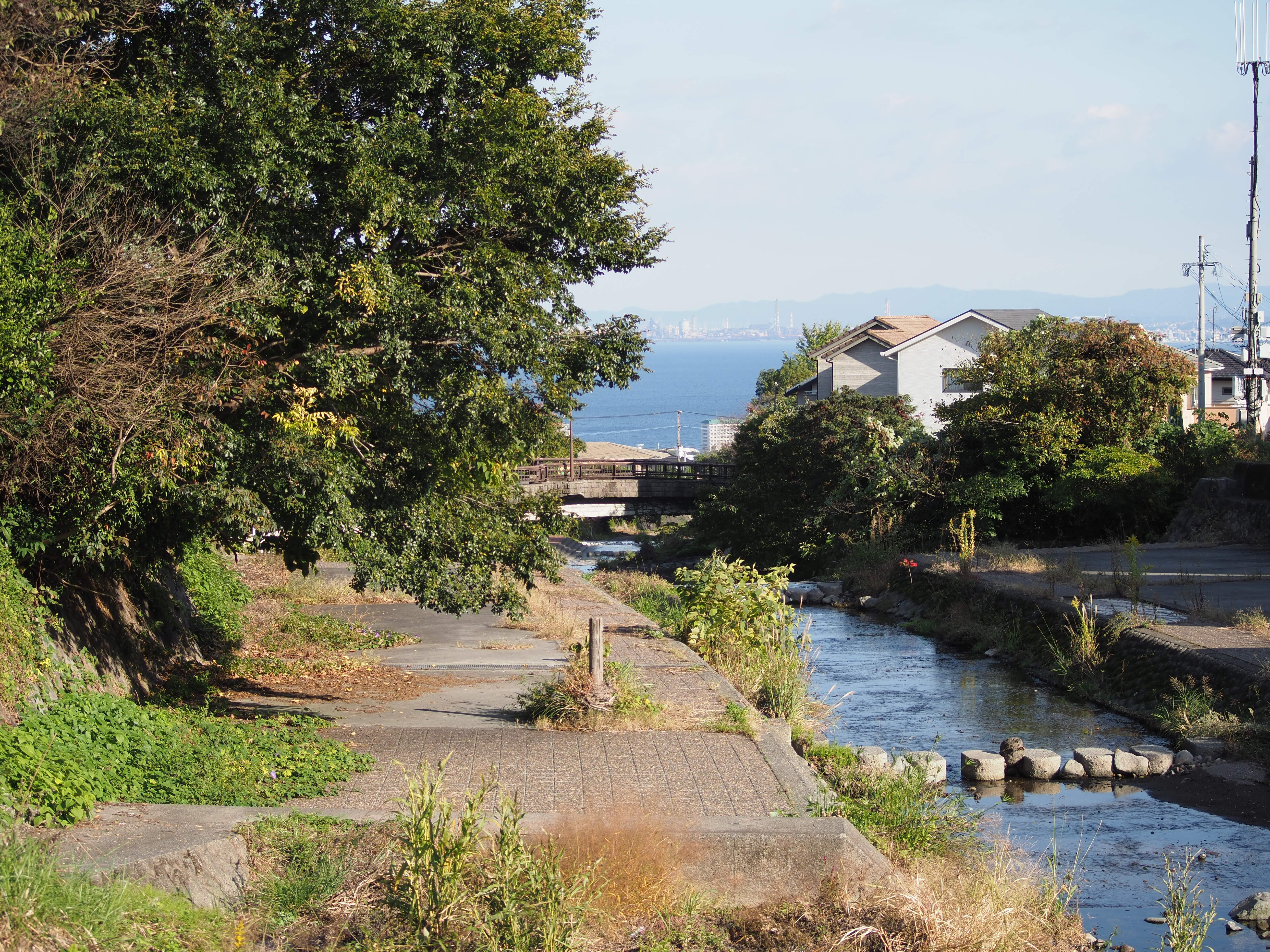 南立石公園町(別府市) 土手上の遊歩道を上流へ