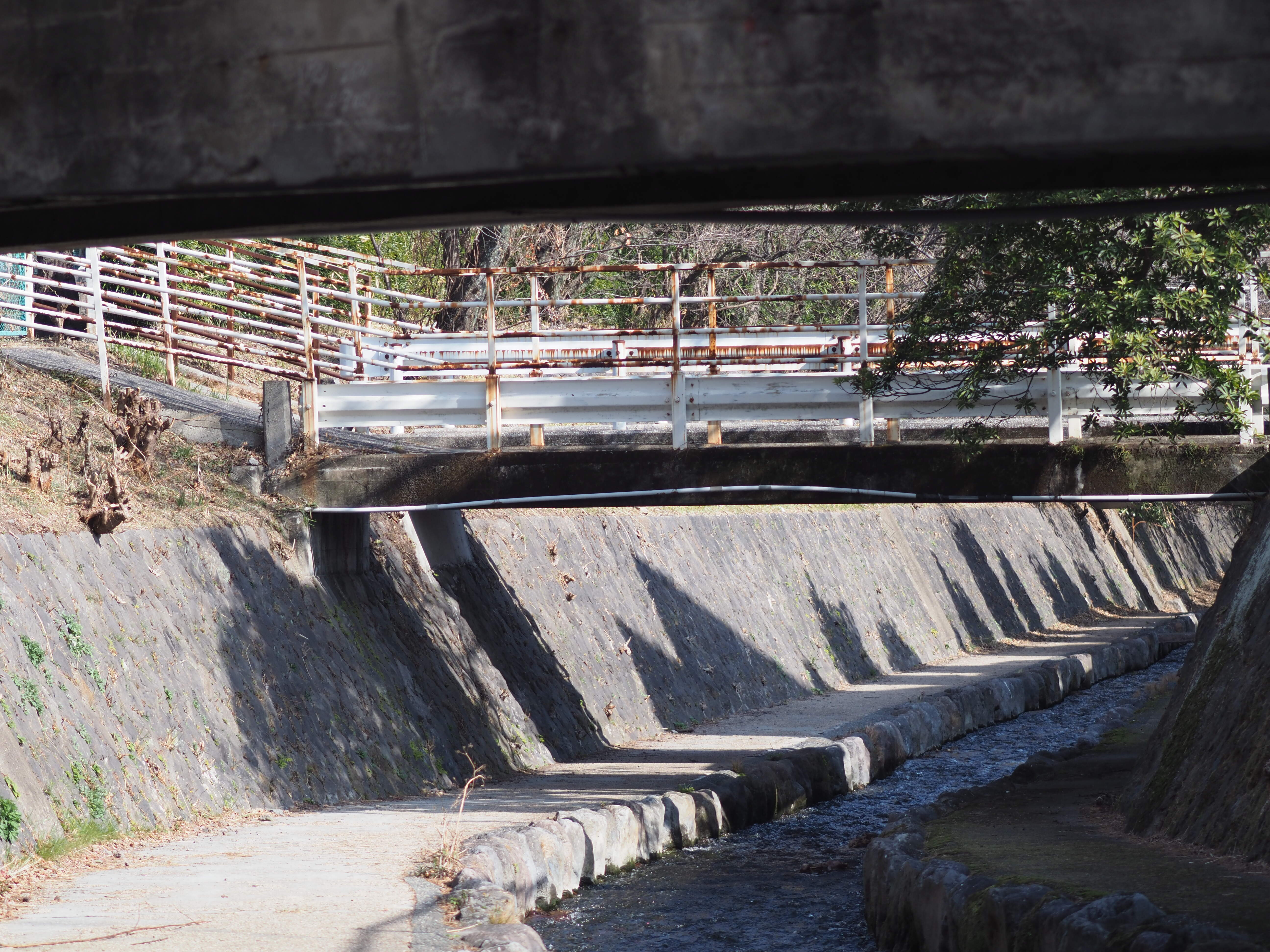 しばらく進んで青山橋をくぐると、すぐに二連の橋が見えてきます。 別府翔青高校の敷地内に架かる駐輪場へ行き来するための橋です。