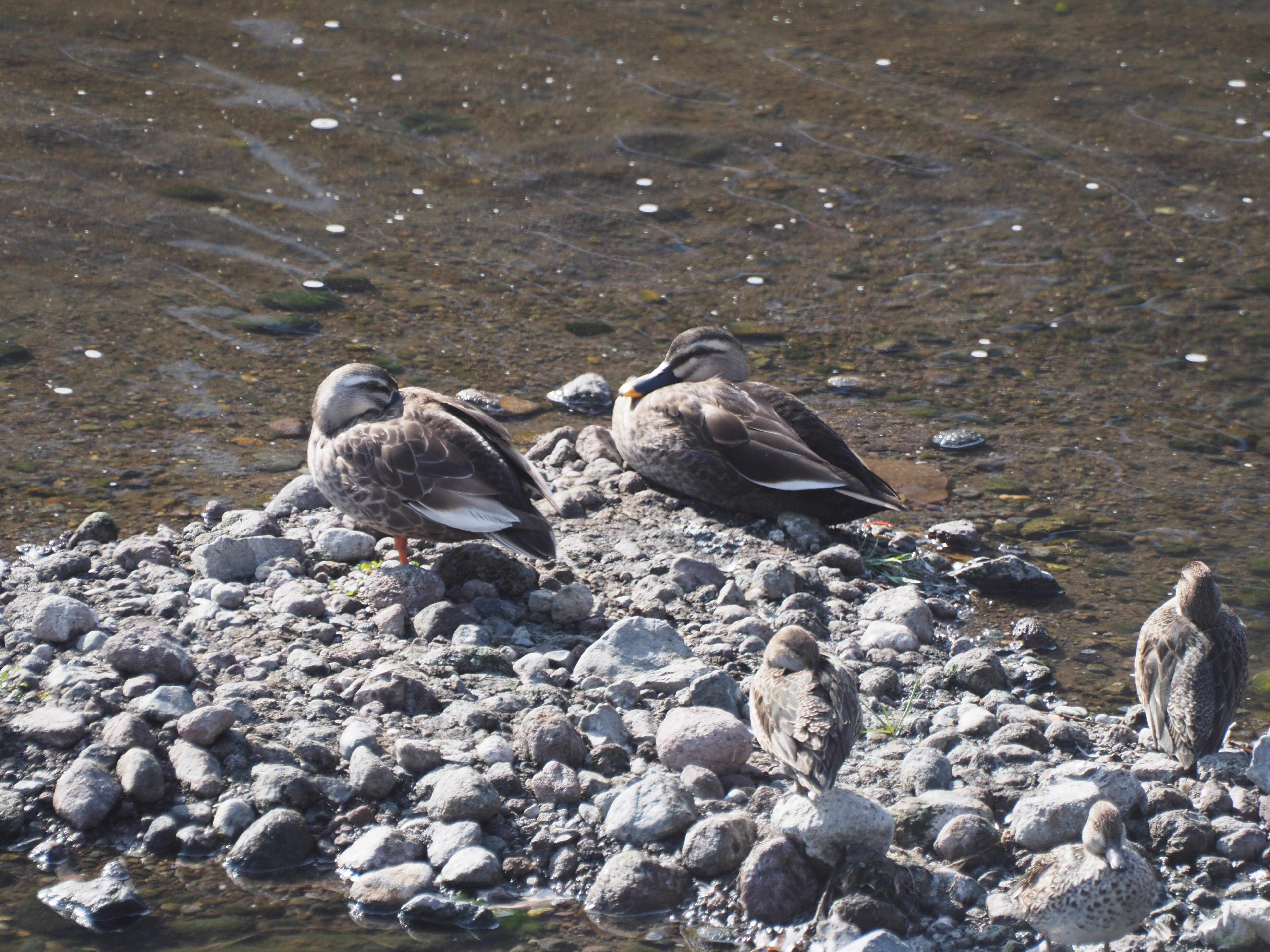 砂防ダムを見下ろすと、つがいのカルガモコガモの群れが目に入ります。
