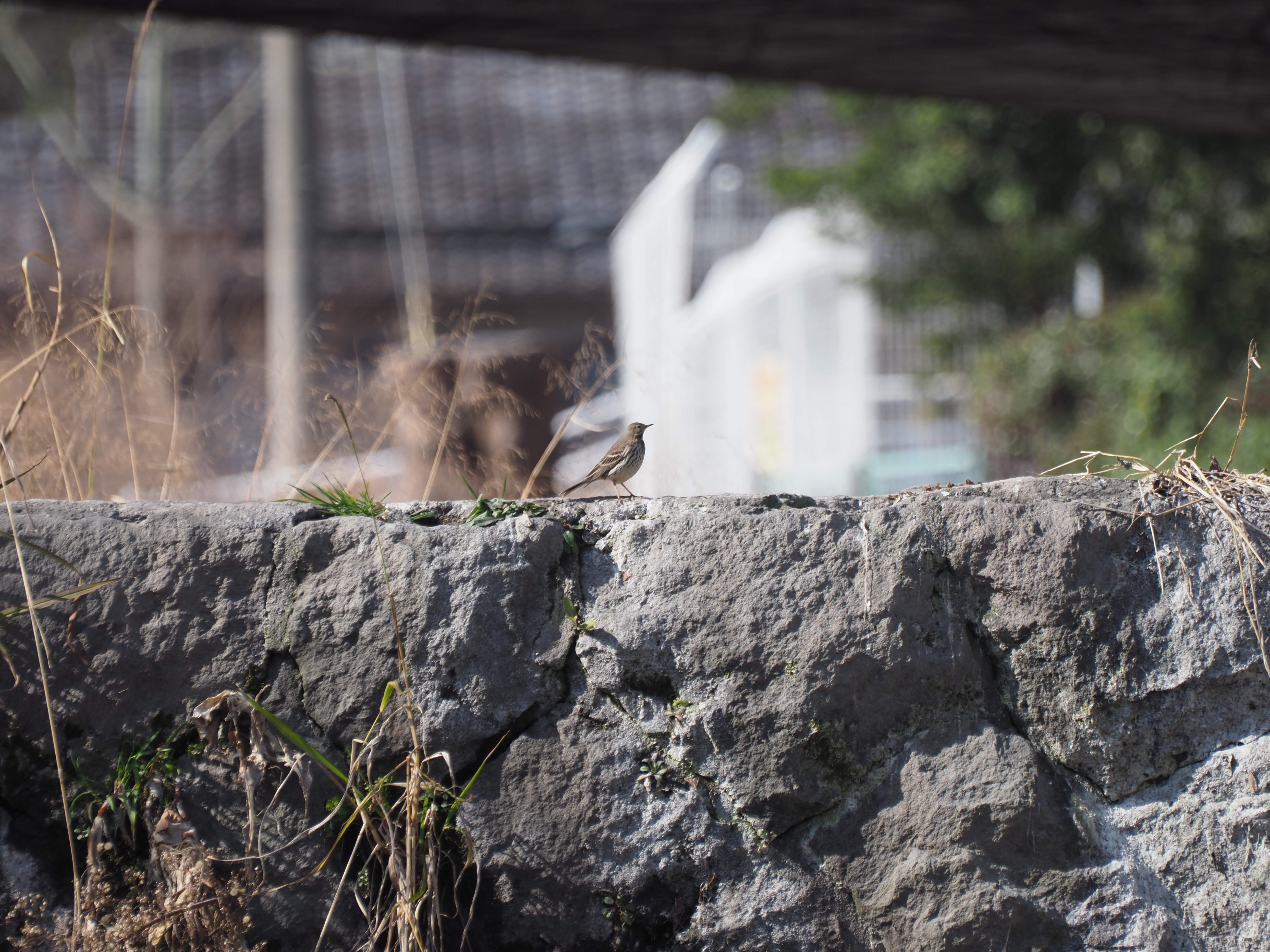 であい橋のすぐ下流でのこと、砂防ダムの島から小さな野鳥が飛び立ち上段の段差に止まりました。 タヒバリっぽいぞ。
