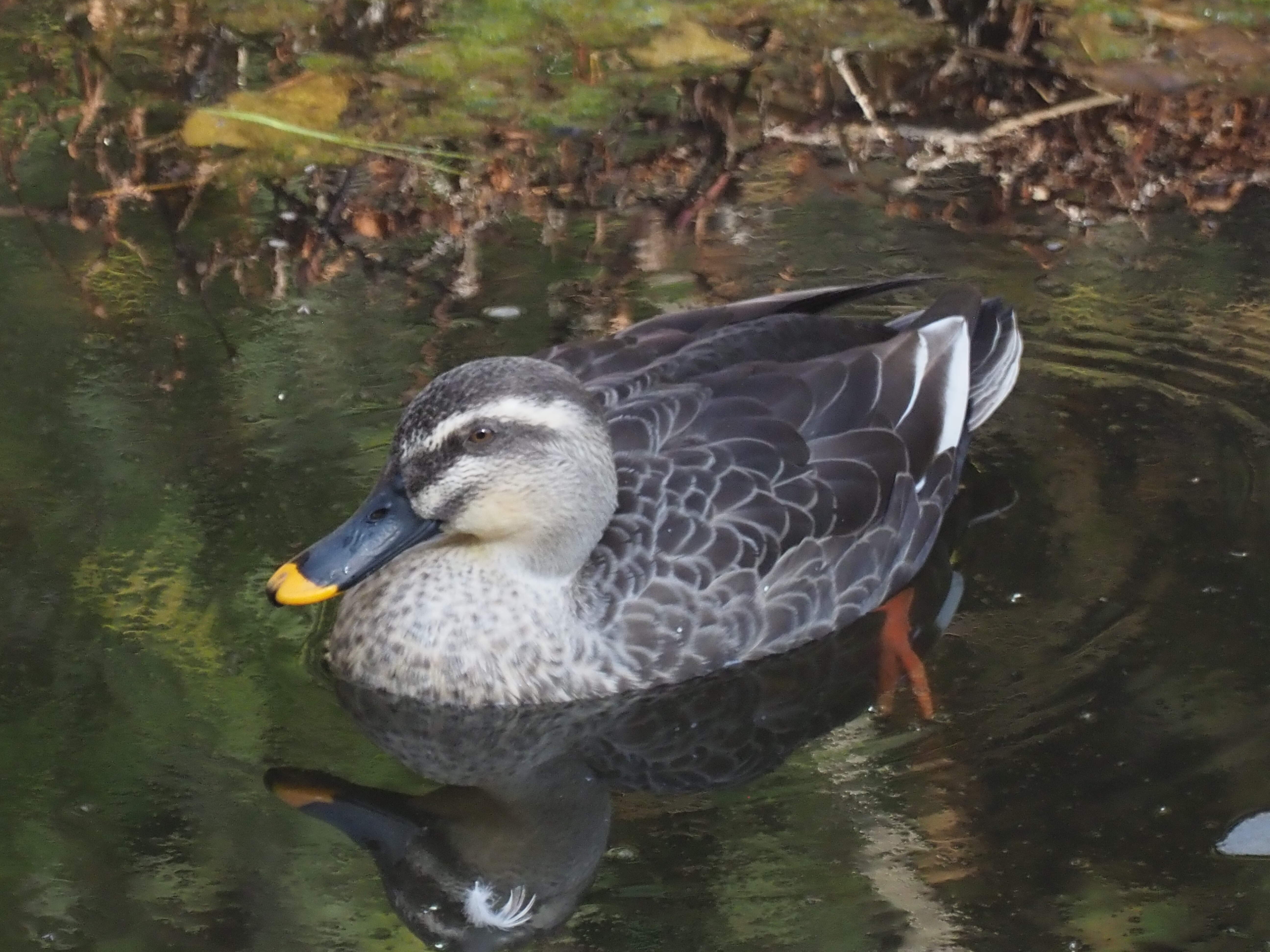 砂防ダムを見下ろすとつがいらしき2羽のカルガモがいます。 デジタルテレコンをオンにして1羽だけ大きく撮影してみました。