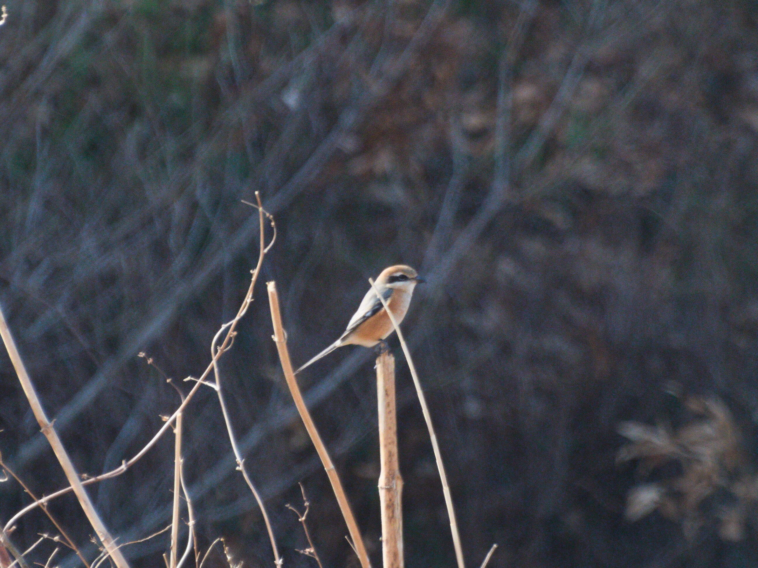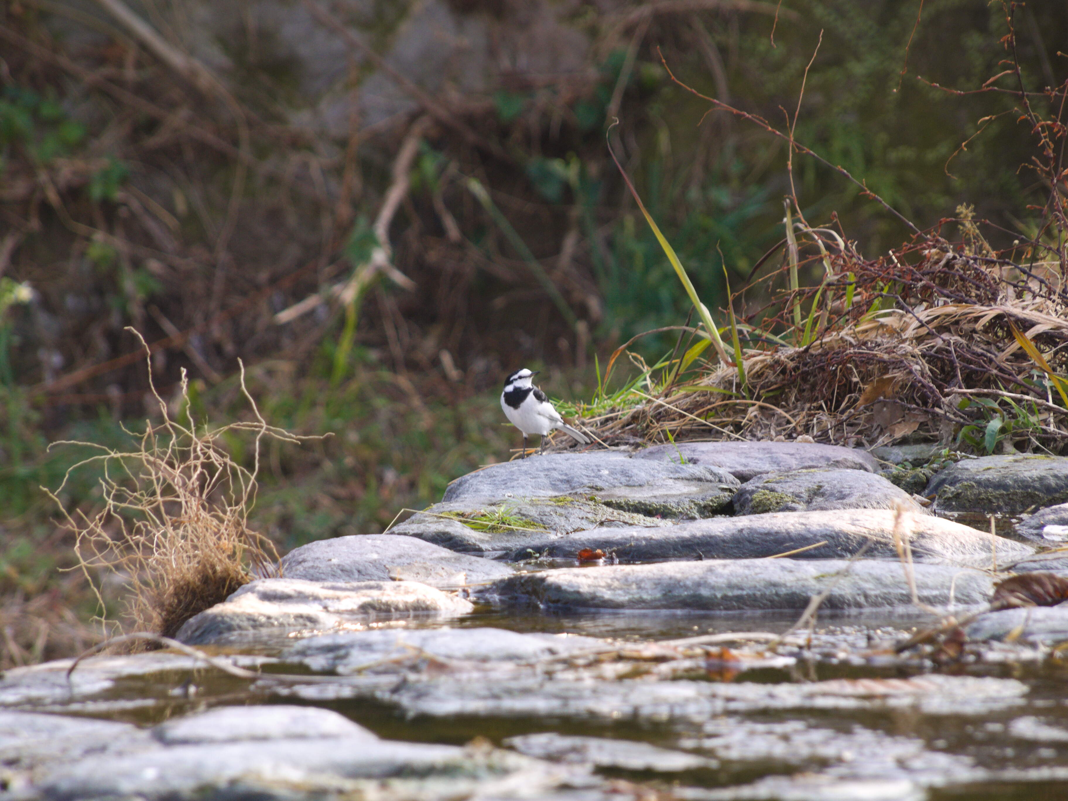 イナコスの橋と西別府橋の間で出会いました。 カダヤシ(だと思っているメダカ大の魚)を撮影しようと飛び石の上でしゃがんでいると、目の前にやって来て枯れ草に止まりました。 300mm(35mm換算:600mm)の超望遠レンズなので、大きく写すことができました。