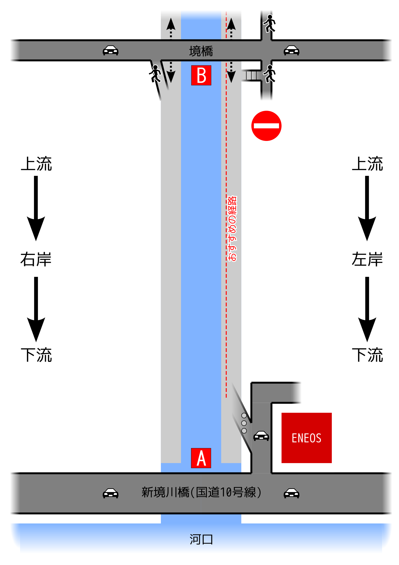 Aの新境川橋(国道10号線)の左岸側のたもとのすぐ上流から河川敷へと入ることができます。 ENEOSが目印です。