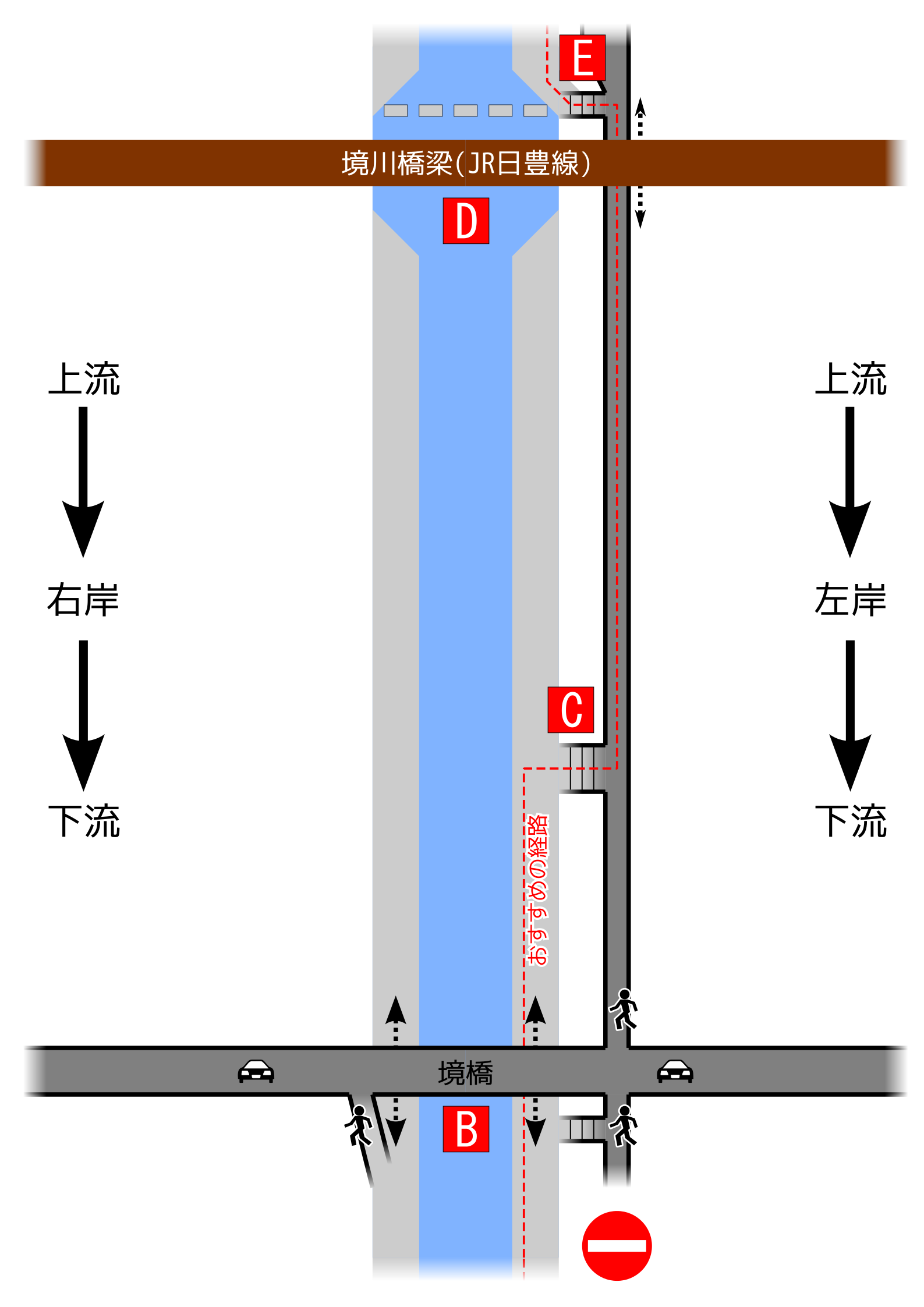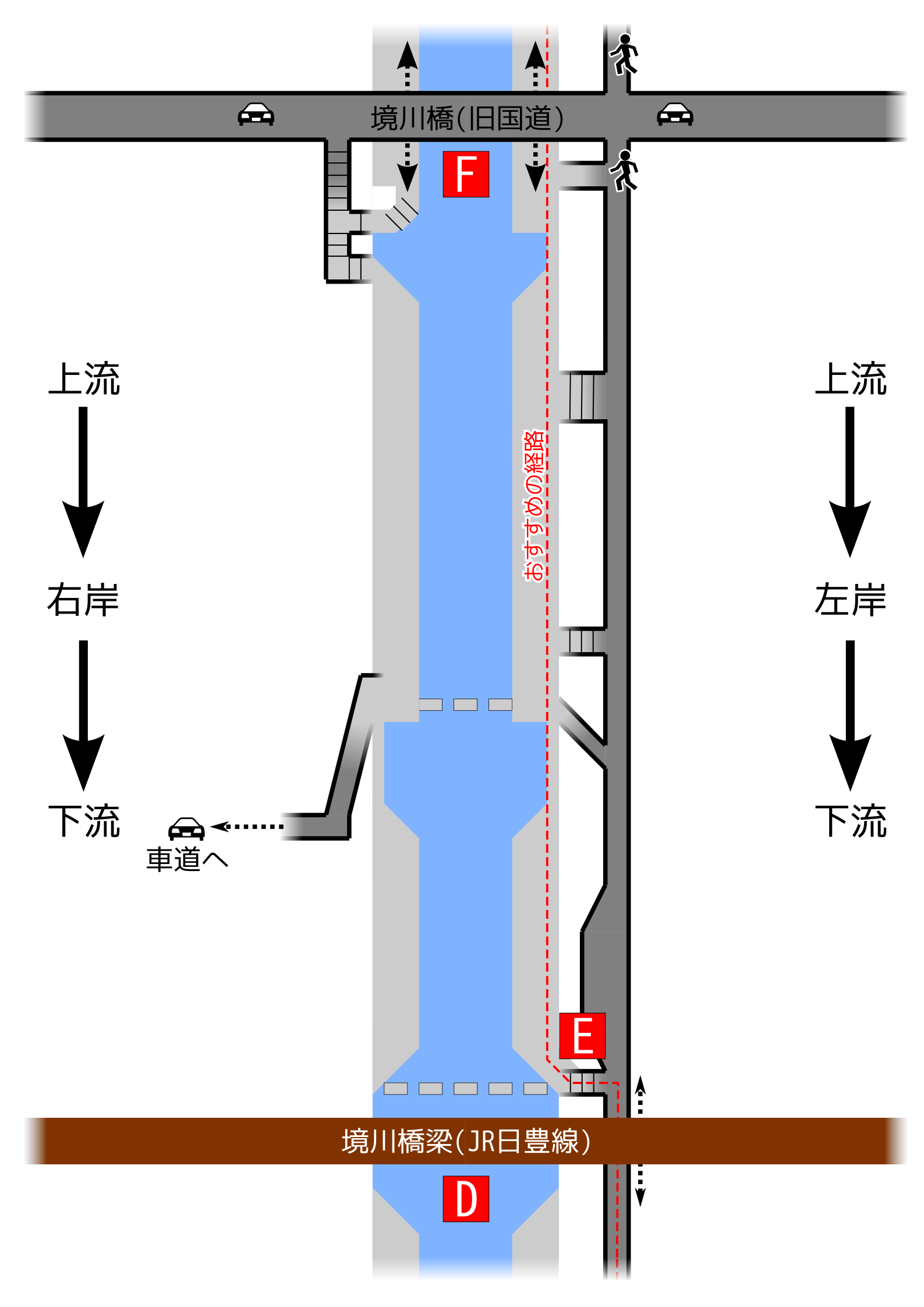 Bの境橋をくぐったら、その先のCの階段で土手上に上がります。 次の砂防ダムは河川敷では越えられないためです。