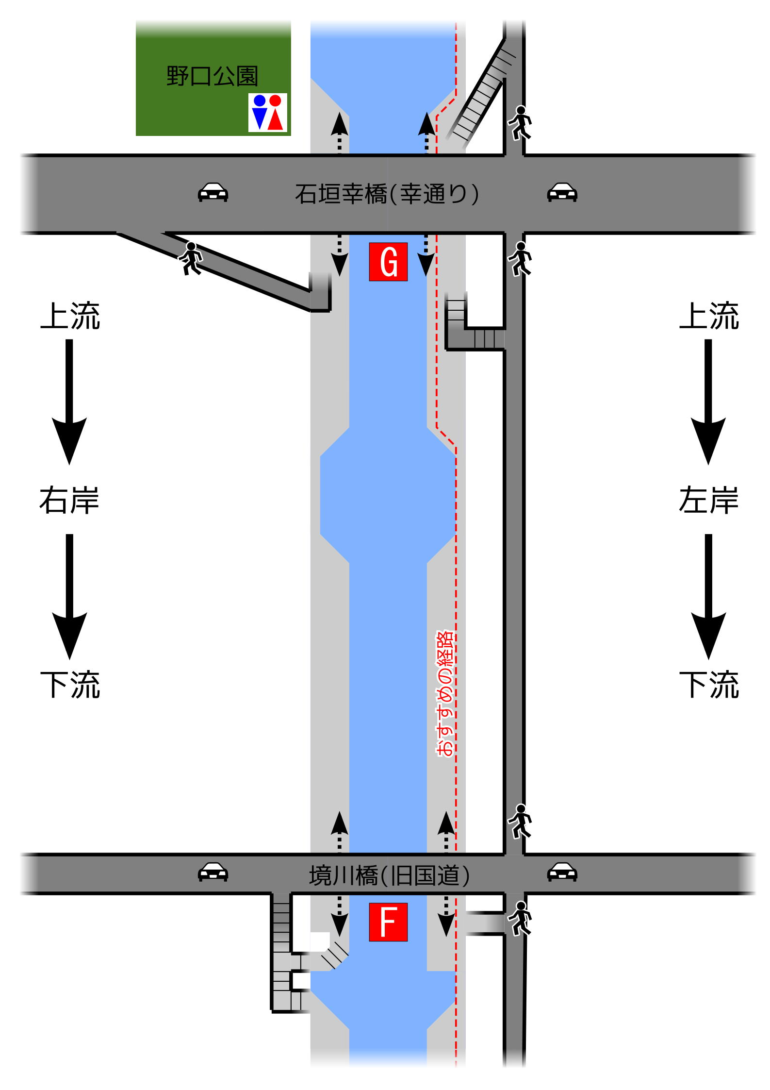 Fの境川橋(旧国道)をくぐったら、そのまま河川敷を上流へ進みます。 その先のGの石垣幸橋(幸通り)も河川敷でくぐります。