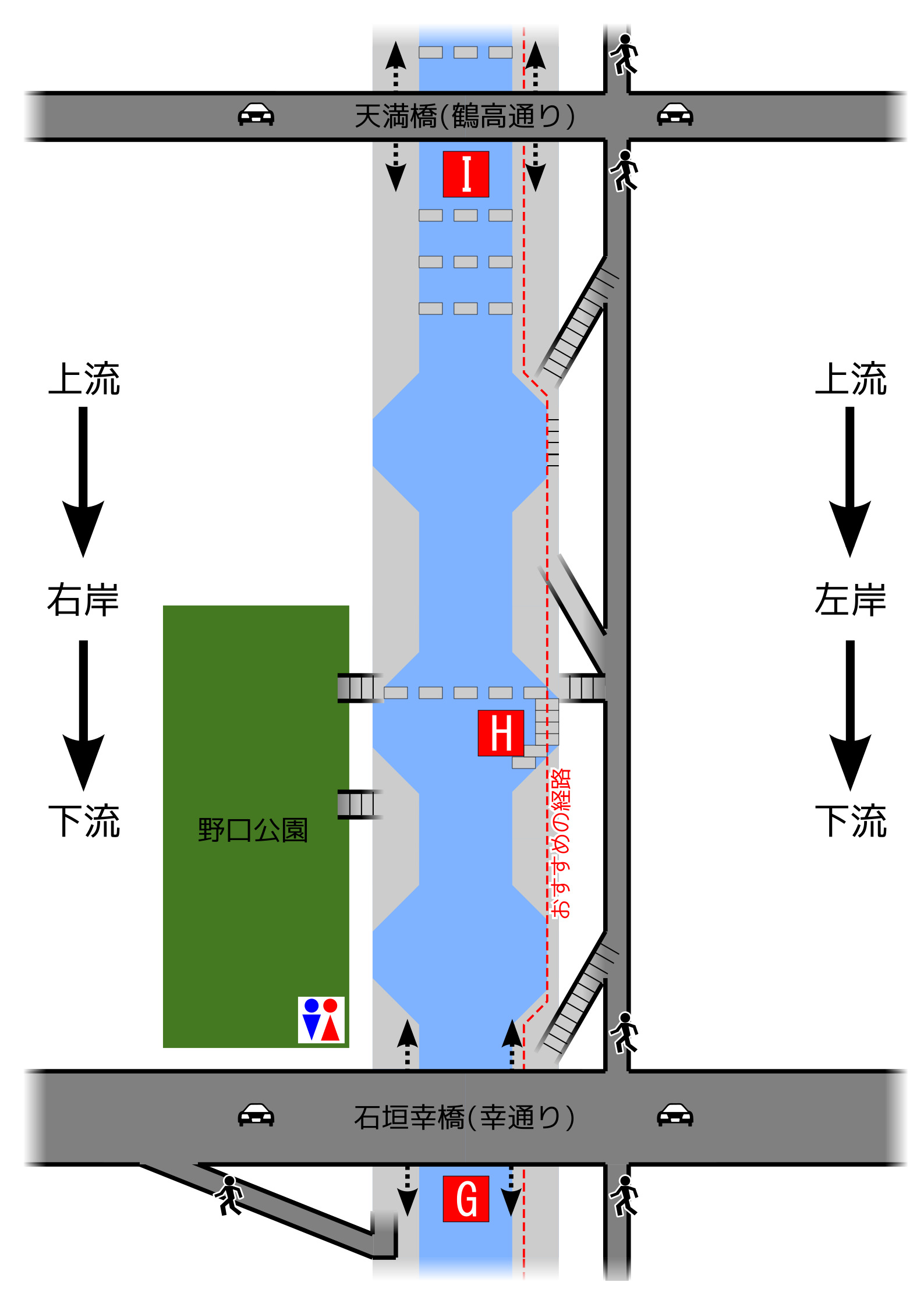 Gの石垣幸橋(幸通り)をくぐったら、そのまま河川敷を上流へ進みます。 Hでは飛び石で砂防ダムを越え、その先のIの天満橋(鶴高通り)も河川敷でくぐります。