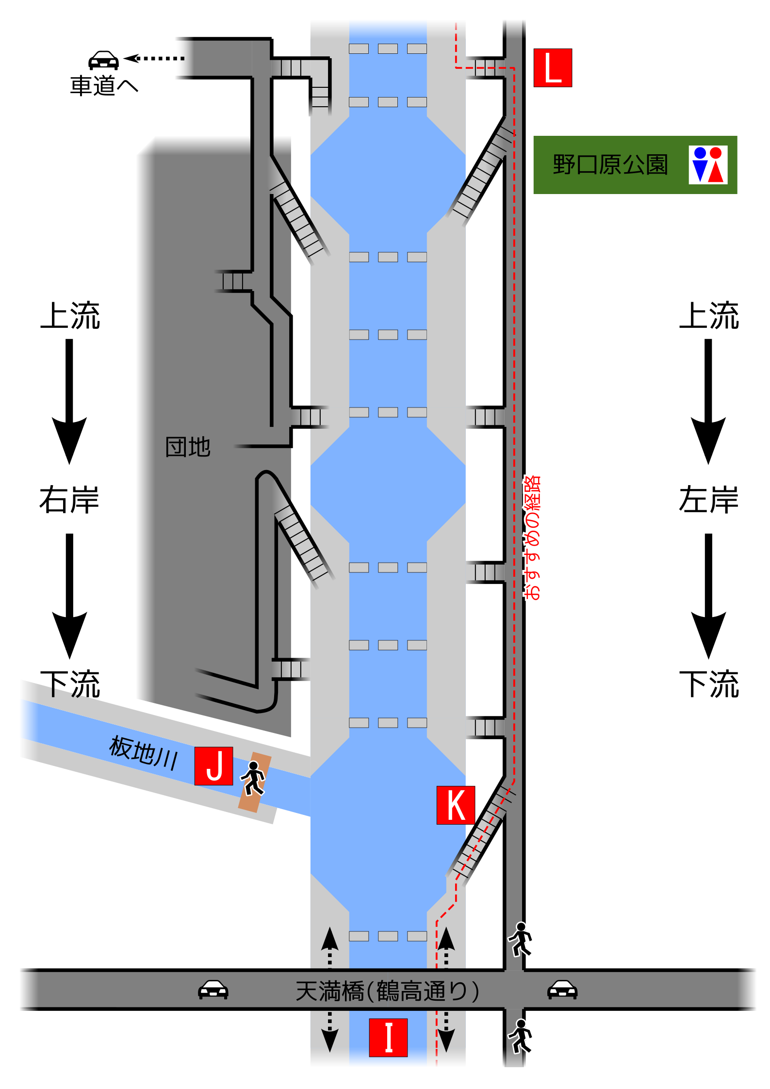 Iの天満橋(鶴高通り)をくぐったら、その先のKの階段で土手上に上がります。 この先の3つの砂防ダムは河川敷では越えられないためです。