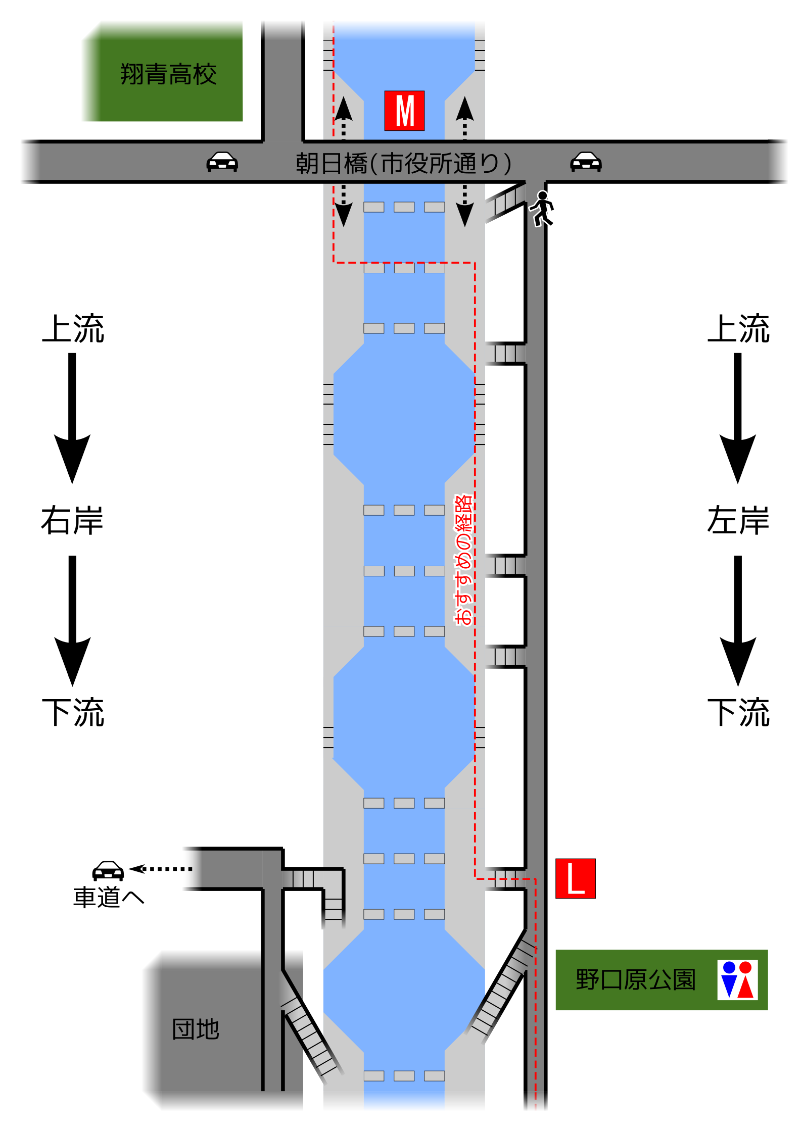 なお、Mの朝日橋(市役所通り)から上流はほとんどの区間で土手上の遊歩道がないため、雑草地帯は道路で迂回する必要があります。