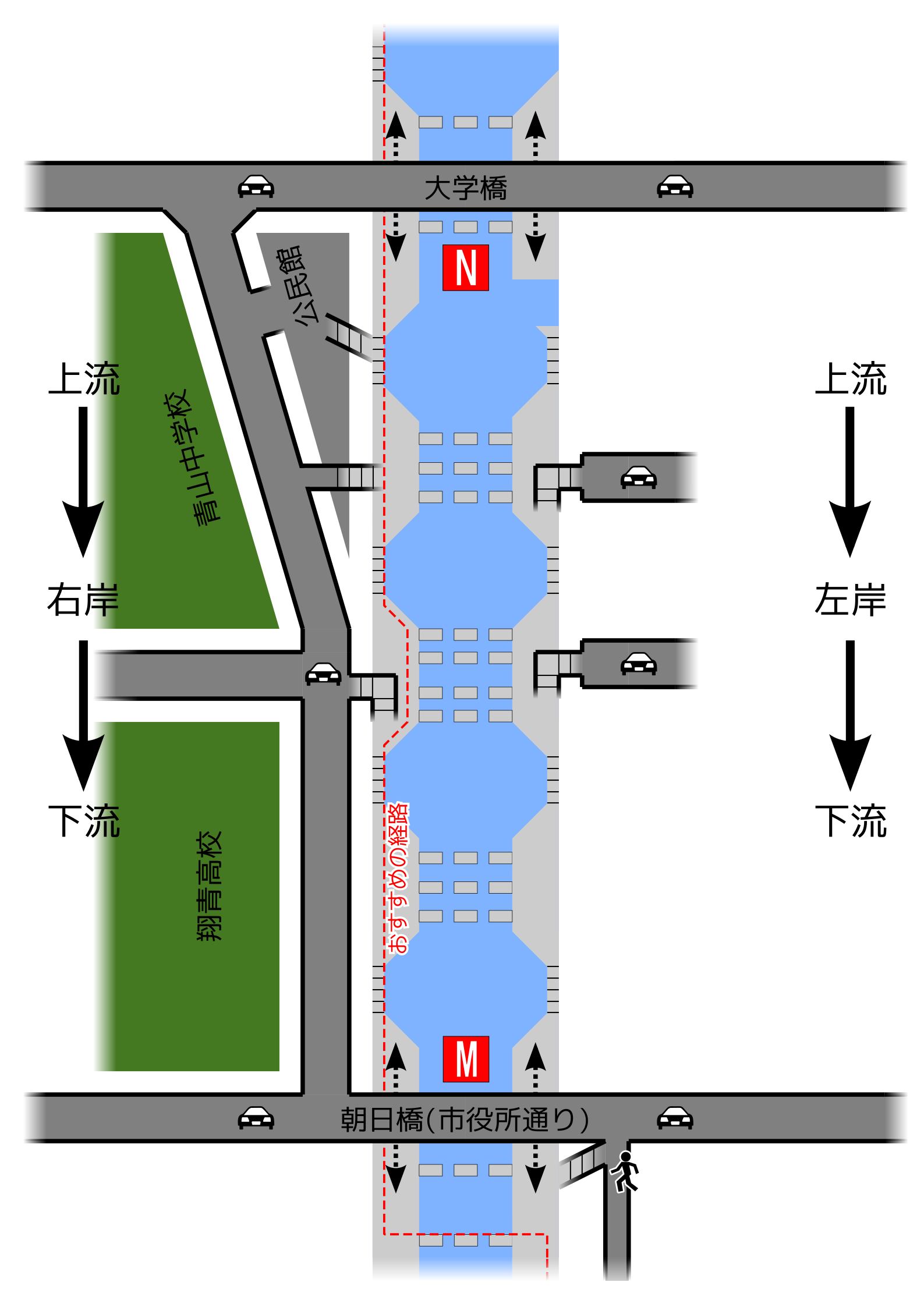Lの階段で河川敷へ下ったら、そのまま河川敷で上流へ進みます。 Mの朝日橋(市役所通り)の手前で飛び石で右岸へ渡り、河川敷でMの朝日橋(市役所通り)をくぐります。