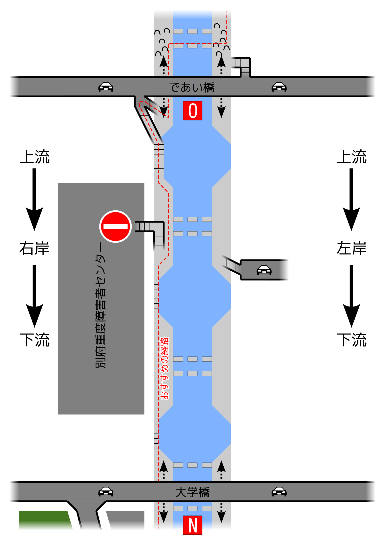 Nの大学橋をくぐったら、引き続き右岸の河川敷を上流へ向かいます。 その先のOの "であい橋" も右岸の河川敷でくぐります。 なお、であい橋をくぐるには、一度道路と同じ高さまで上る必要があります。