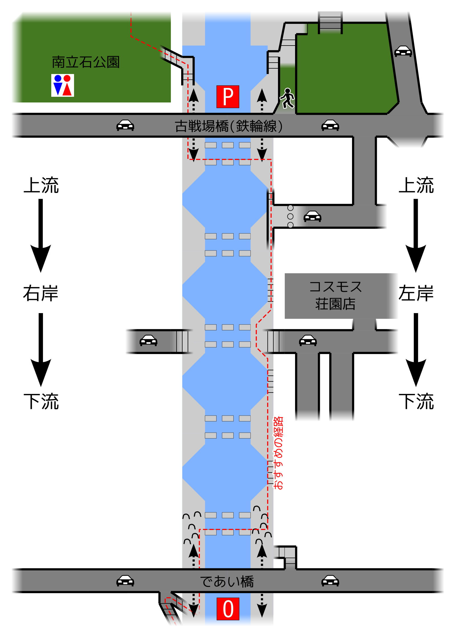 左岸へ渡ったら河川敷を上流へ進み、Pの古戦場橋(鉄輪線)の手前で飛び石で右岸へ渡ります。 右岸の河川敷でPの古戦場橋(鉄輪線)をくぐったら、その先の階段で南立石公園へ上がります。 この先(6つ先の砂防ダムまで)の区間は雑草や土砂の堆積が多いため、冬季以外は河川敷を進めないためです。