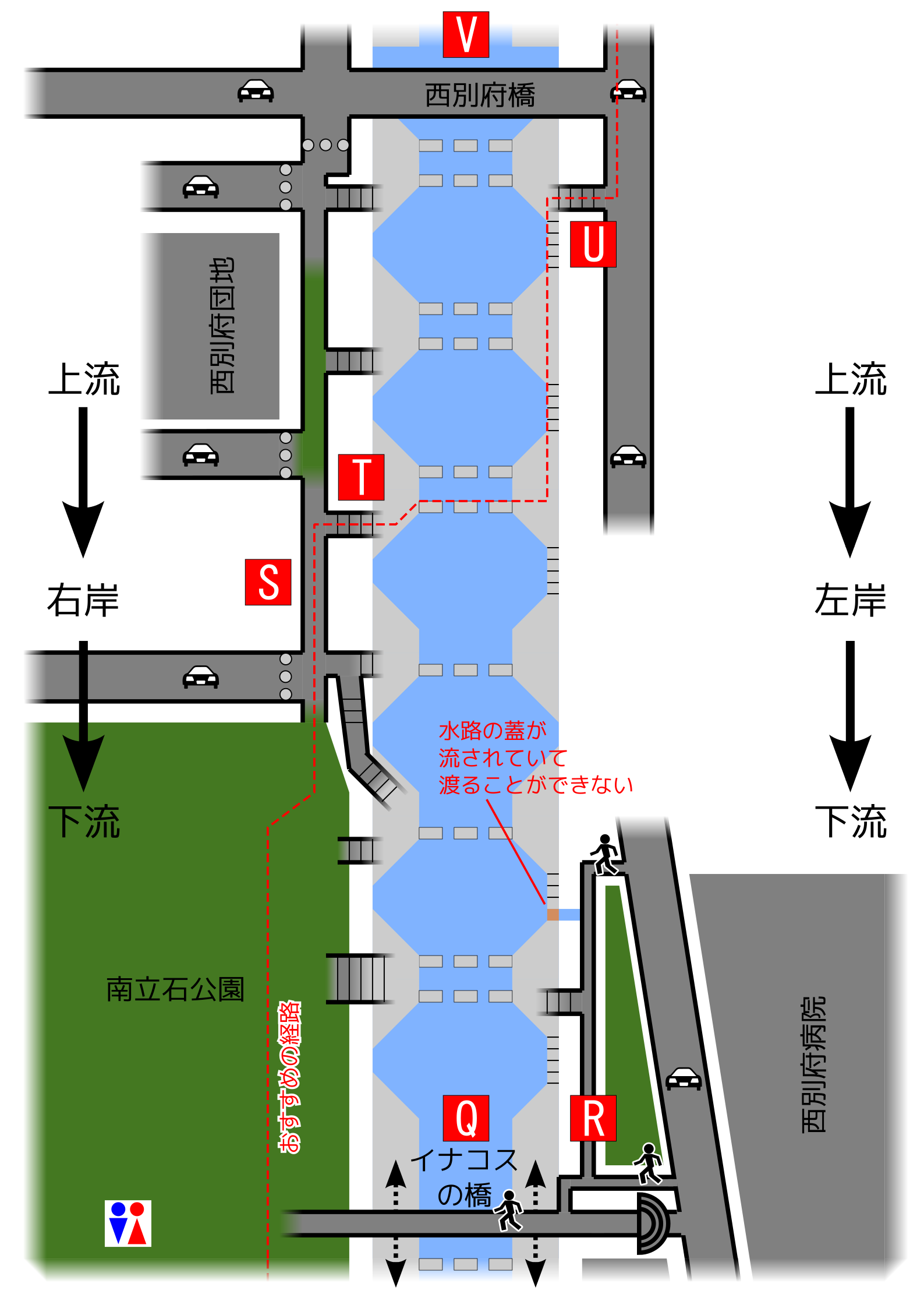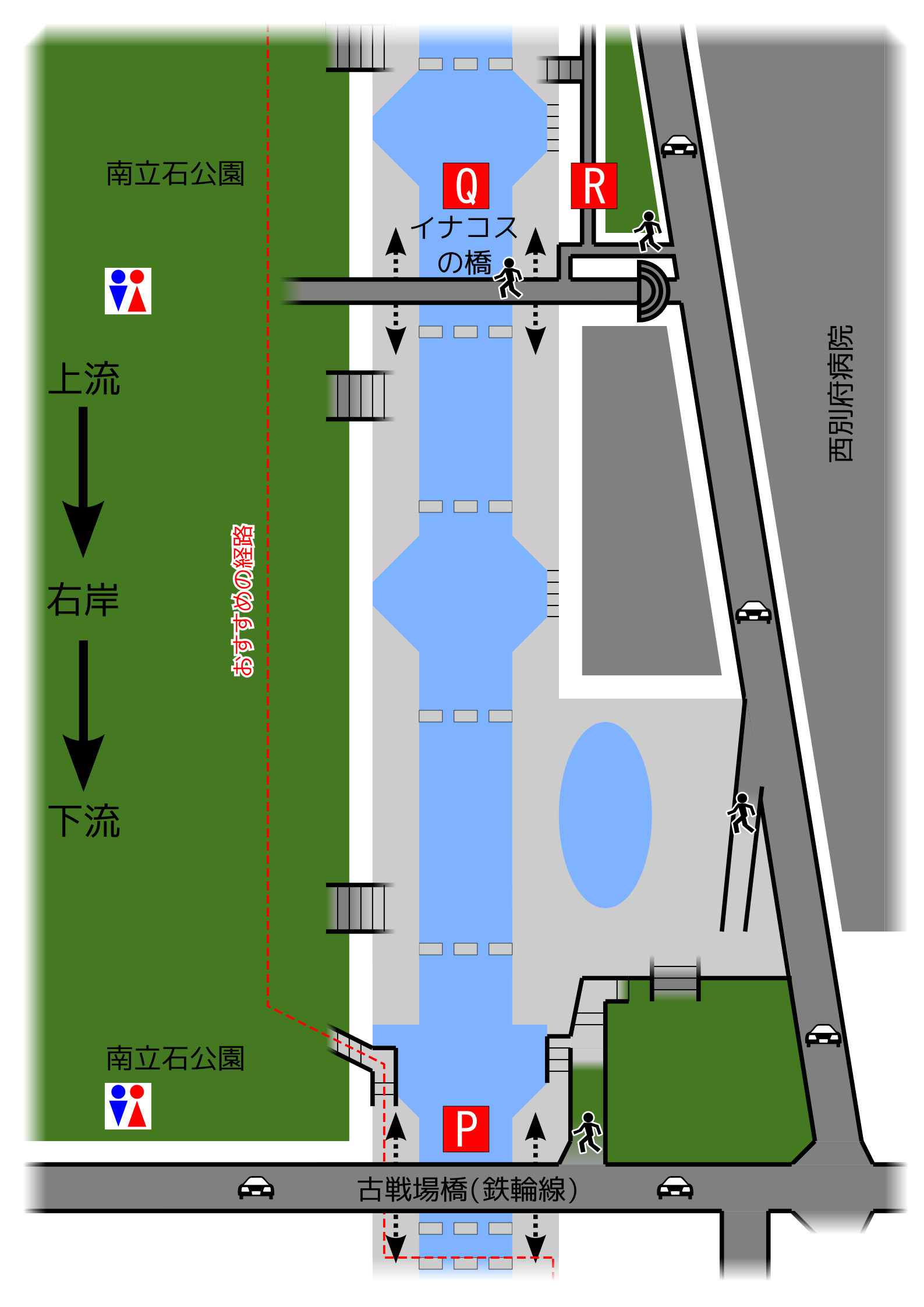 おすすめの経路を外れてQのイナコスの橋で左岸へ渡り、車椅子用のスロープに進むとRの土手上の遊歩道への分岐があります。