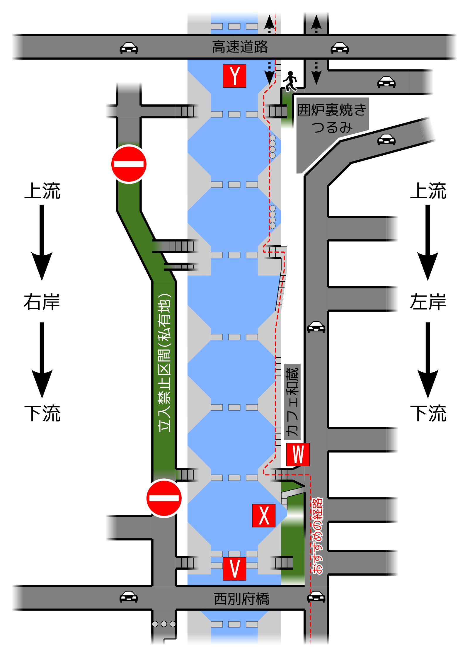 Vの西別府橋を越えて上流へ160メートルほど進むと、Wの河川敷への階段が現れます。 なお、階段のすぐ上流にはカフェ和蔵(和・style shop&cafe 和蔵)があります。